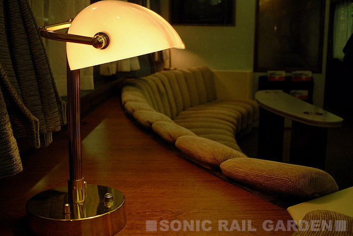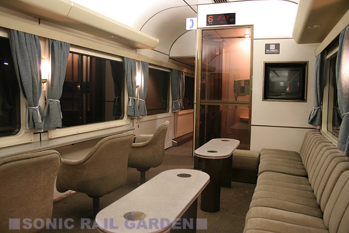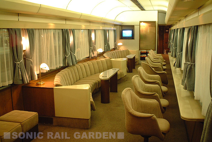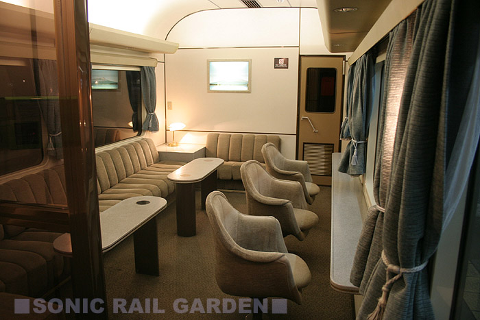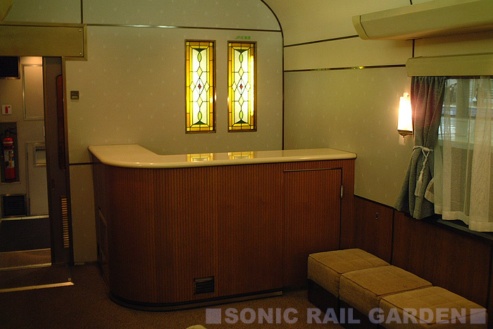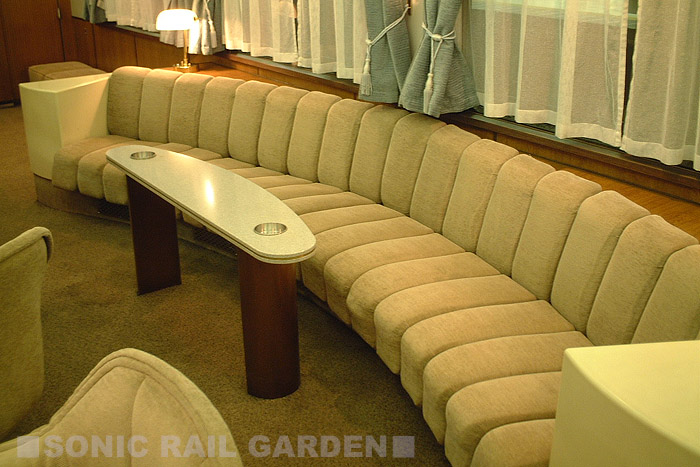 JR北海道では1両丸々が「ロビー」で構成されている、純粋な「ロビーカー」も持っています。 「カシオペア」登場する以前、「北斗星」が3往復運転だった頃の「北斗星3・4号」は JR東日本とJR北海道の編成が隔日で交代に充当されていました。 この列車に使われていたのが、ここで紹介する「全室ロビーカー」です。 室内はすべてのソファーが海峡側を向いて設置されていて、JR東日本のロビーカーの構成とは一味違った雰囲気。 ソファーは滑らかな弧を描くラウンドタイプで、このあたりも直線的なソファーのJR東日本車とは対照的です。 客室内にはバーコーナーのようなカウンターが設けられています。(使われたことはないようですが) 車端部にはもちろん電話コーナーとシャワーブースを完備。デッキには、おつまみの自販機も備えていました。 |