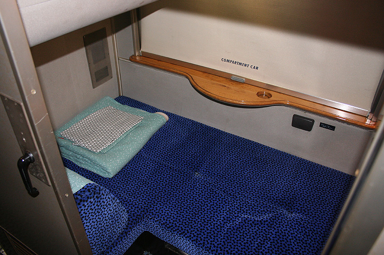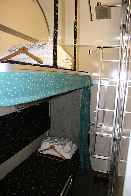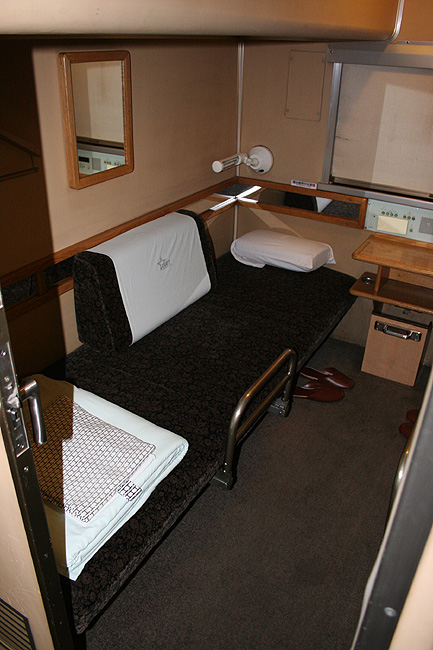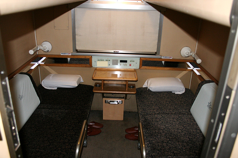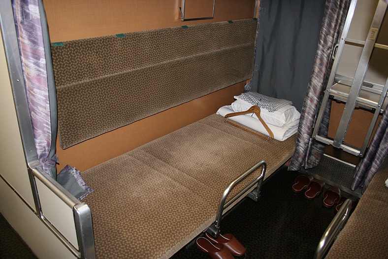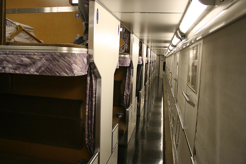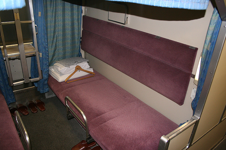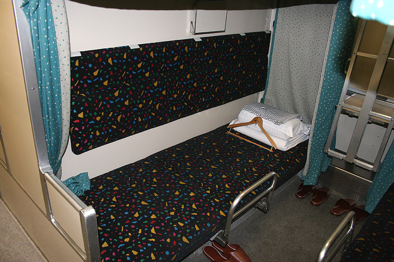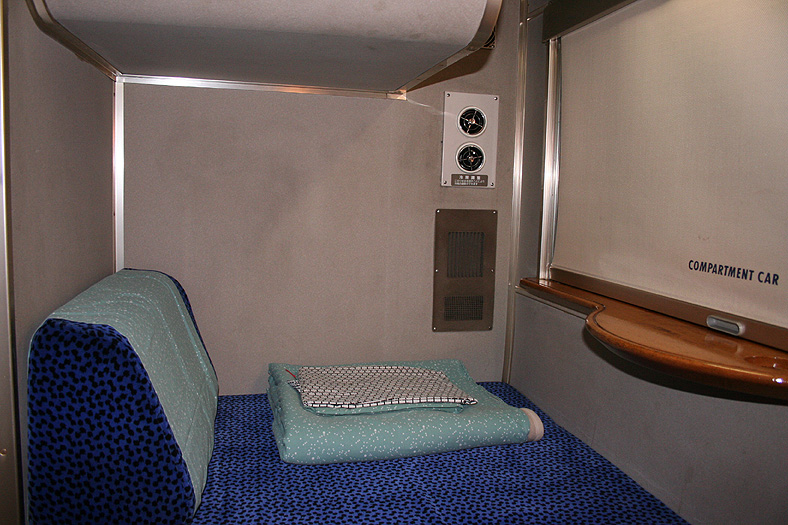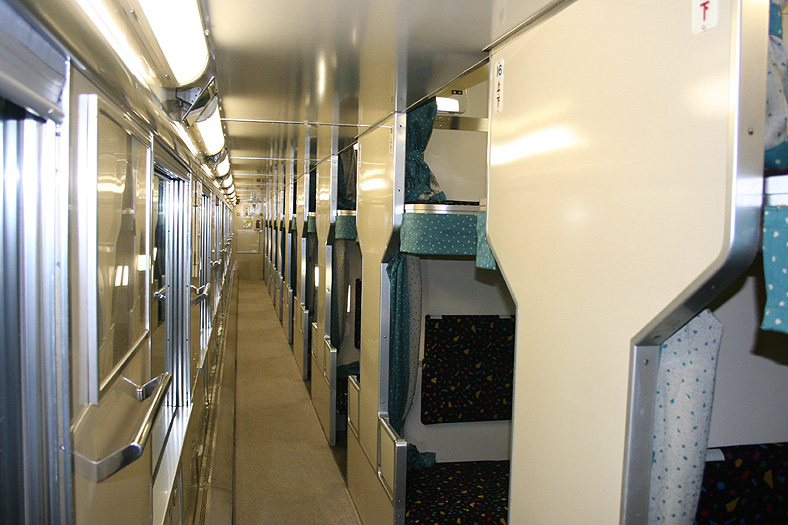 乗車した日は、4両のB寝台車で3タイプの寝台モケットが見られるという、バリエーションの多さにビックリ。 「タイプ1」は、木目調のパネルで寝台内の雰囲気がガラッと変わったタイプ。 モケットには787系「つばめ」を連想させるシックなベージュのボチボチモケットが使われています。 床面はリノリウムのまんまですが、これも787系「つばめ」をイメージしたボチボチのテキスタイルになっています。 ここで紹介する3タイプのうちで、もっとも好感の持てるイメージチェンジです。 「タイプ2」は、アズキ色のモケットに張り替えられたタイプ。 あんまりカラーポリシーが感じられない、やっつけ仕事一直線なイメージ。おそらく初期のリニューアルかと思われます。 床面はカーペット敷きになっていますが、このカーペットの色が暗いので、車内全体がくすんで見えます・・残念! 「タイプ3」は、もはや「ブルトレでこれはどうなのよ?!」と誰しもが思う、883系「ソニック」タイプ。 没落激しいブルトレを「明るく見せよう!」と、“ワンダーランドエクスプレス・テイスト”を持ち込んだのかもしれませんが・・ 車内のあまりの閑散ぶりに、ド派手なモケットだけがギンギラギン。別の意味で「ワンダーランド」になってしまいました。 |