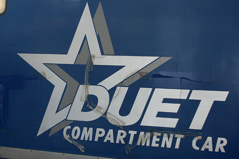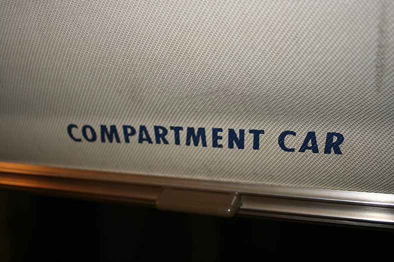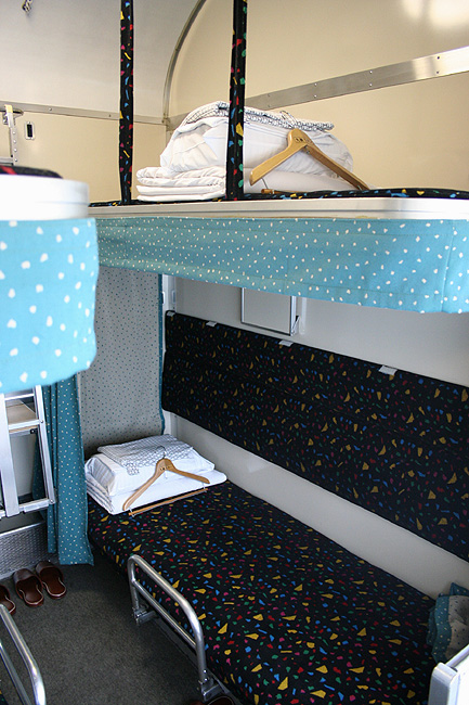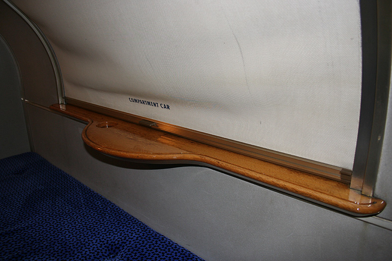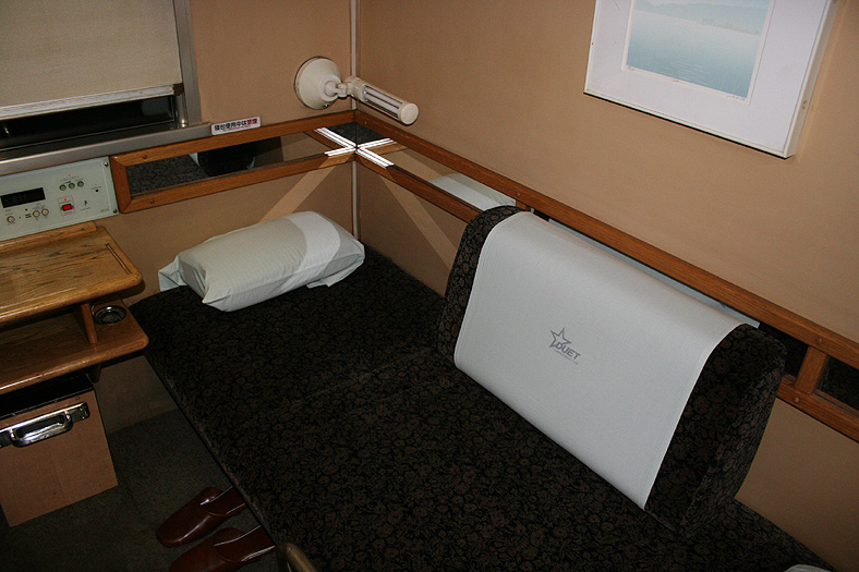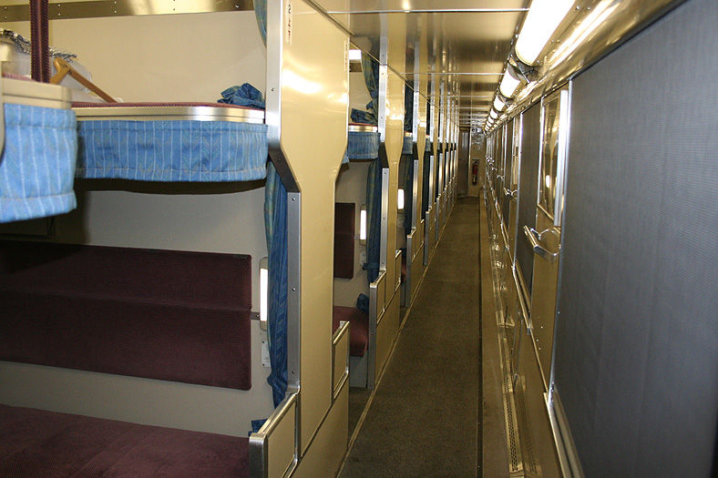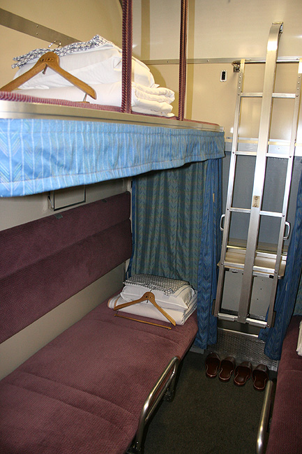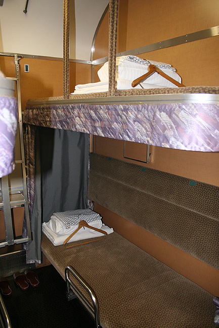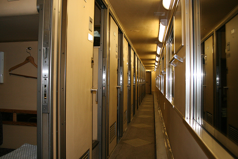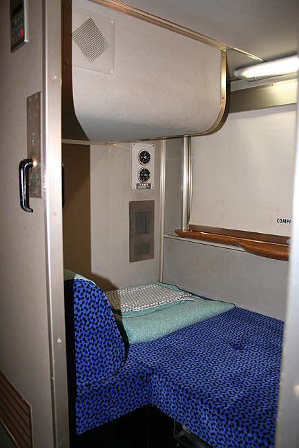 乗車した日は、4両のB寝台車で3タイプの寝台モケットが見られるという、バリエーションの多さにビックリ。 「タイプ1」は、木目調のパネルで寝台内の雰囲気がガラッと変わったタイプ。 モケットには787系「つばめ」を連想させるシックなベージュのボチボチモケットが使われています。 床面はリノリウムのまんまですが、これも787系「つばめ」をイメージしたボチボチのテキスタイルになっています。 ここで紹介する3タイプのうちで、もっとも好感の持てるイメージチェンジです。 「タイプ2」は、アズキ色のモケットに張り替えられたタイプ。 あんまりカラーポリシーが感じられない、やっつけ仕事一直線なイメージ。おそらく初期のリニューアルかと思われます。 床面はカーペット敷きになっていますが、このカーペットの色が暗いので、車内全体がくすんで見えます・・残念! 「タイプ3」は、もはや「ブルトレでこれはどうなのよ?!」と誰しもが思う、883系「ソニック」タイプ。 没落激しいブルトレを「明るく見せよう!」と、“ワンダーランドエクスプレス・テイスト”を持ち込んだのかもしれませんが・・ 車内のあまりの閑散ぶりに、ド派手なモケットだけがギンギラギン。別の意味で「ワンダーランド」になってしまいました。 |