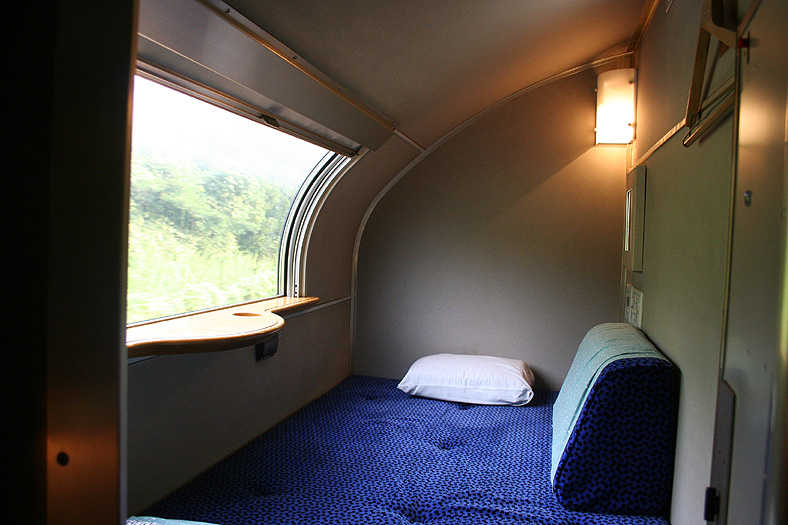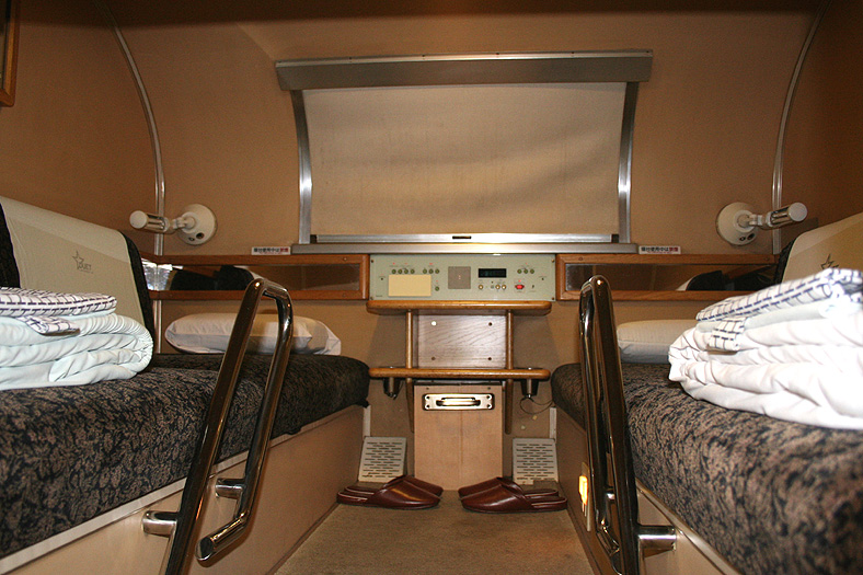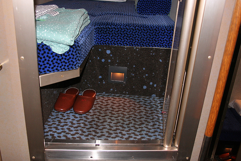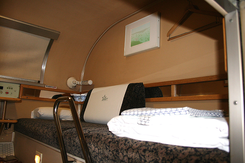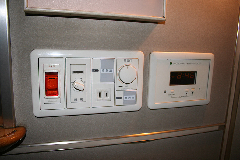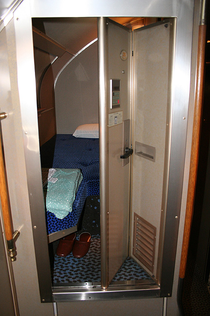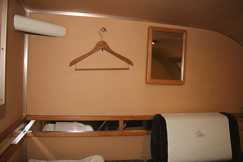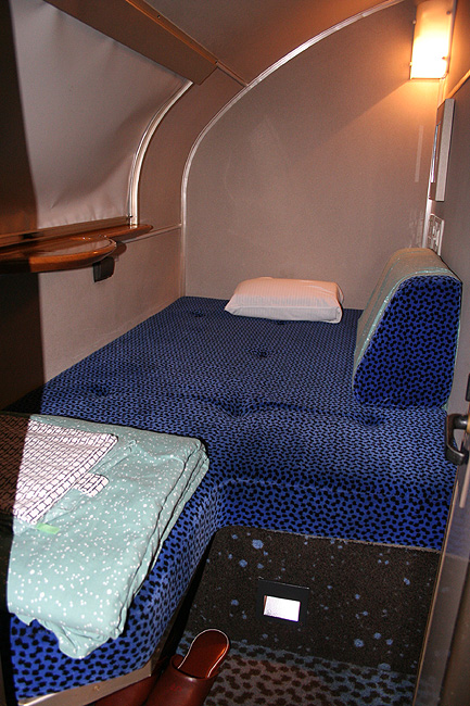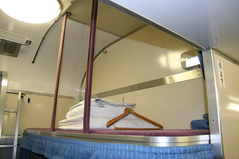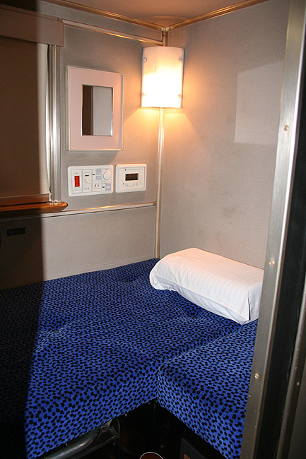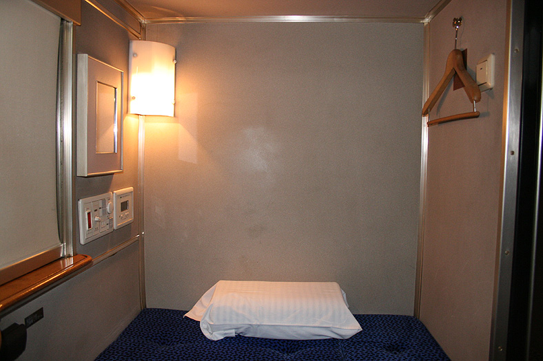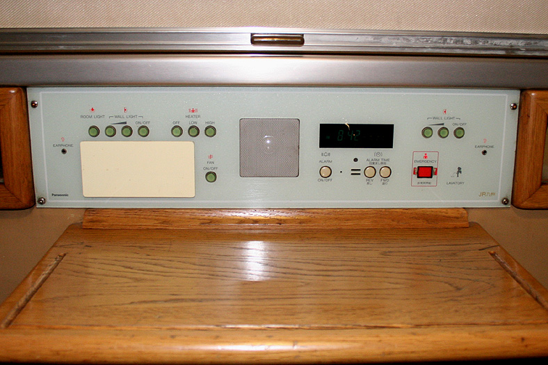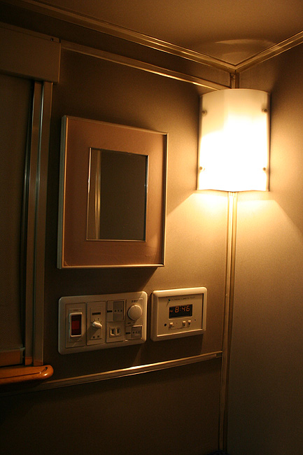 一人旅の強い味方、B個室「ソロ」。「なは」号に連結されているのはレール方向にベッドがセットされた、室数の多いタイプ。 各個室は上下2段に設定されたユニット構造で、全28室。偶数番号が2階個室で、奇数個室が1階個室になっています。 室内はほぼ一面がベッドスプレッドで覆われていて、寝て移動することに特化した個室構造。 このため、ベッドサイズが縦1,925mm×横幅1,000mmと、ベッド幅が破格の広さになっているのが特徴的です。 このタイプの「ソロ」に共通していえるのですが、1階個室よりも2階個室のほうが開放感があります。 2階個室の天井に向かって大きく湾曲する壁と窓には好みが分かれるところでしょうが、 1階個室は2階個室からの張り出しなどもあって、極端に室内が狭く感じられます。 通路から2階個室への階段は、隣り合う2室で共有するタイプ。 曲線でデザインしたステップと壁面に飾られた絵画が、リーズナブルな個室にはもったいないほどの優雅さを醸し出しています。 室内の枕元壁面にはコントロールパネル類が集約されて設置されています。 パネル内には電源用のコンセントが1つ用意されています。 おそらくは髭剃りシェーバー用の電源だと思うのですが、位置的にちょっと使いにくいです。 MacintoshのノートPCやボックスタイプのデジカメ充電器・携帯電話充電コードなど、特殊なカタチのプラグだと、 コンセントのまわりにある換気扇スイッチや室内灯スイッチに干渉されてしまって、プラグが完全に差し込めません。 この「ソロ」でPCやデジカメ・携帯電話の充電をする予定の方は、短くてもいいので延長コードをご用意されたほうがいいかも。 室内照明は、天井の蛍光灯(室内灯)のほかに枕元の読書灯と靴脱ぎのステップにある足元灯があります。 室内灯と読書灯はそれぞれ独立してオンオフが可能ですが、足元灯はスイッチがなく、消すことはできません。 |