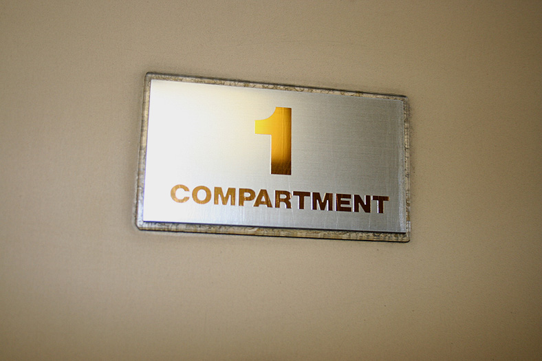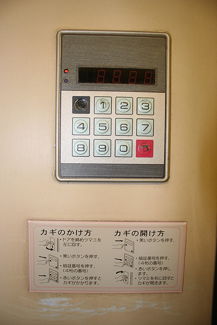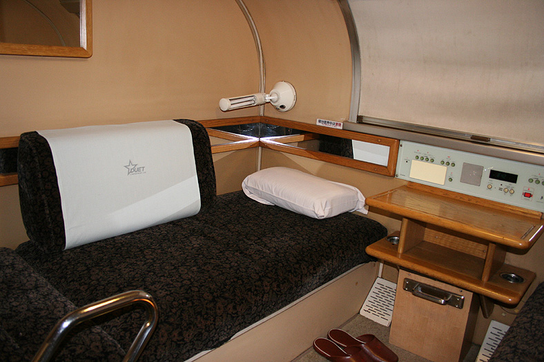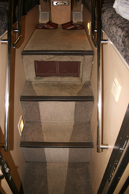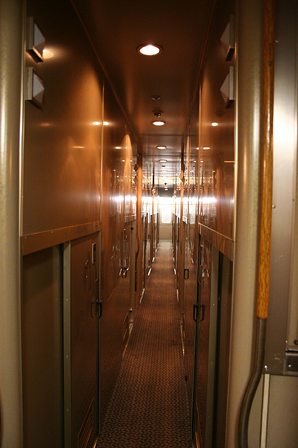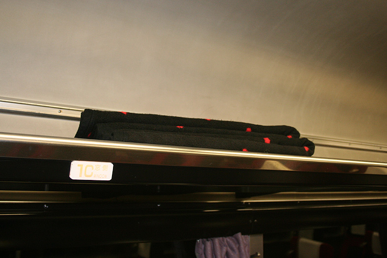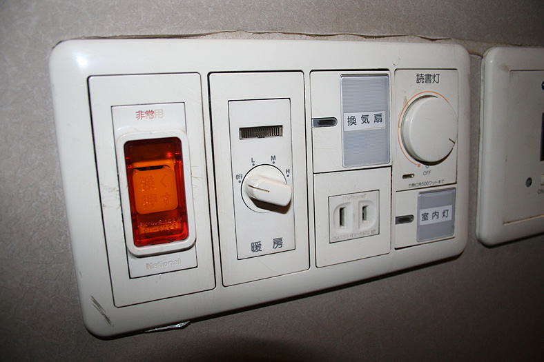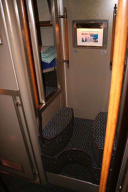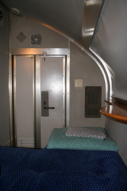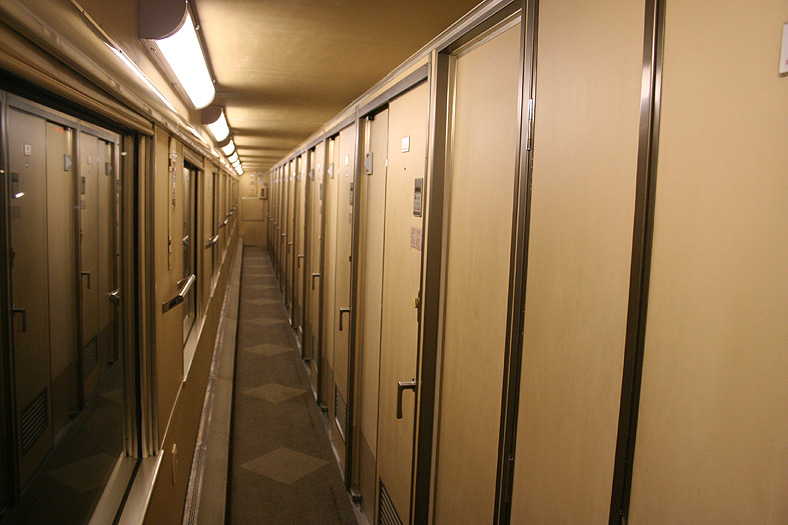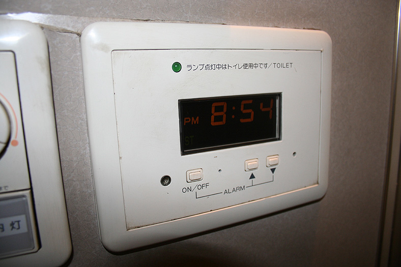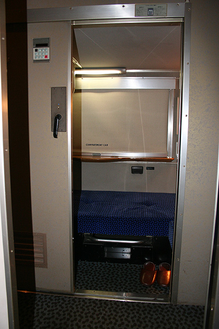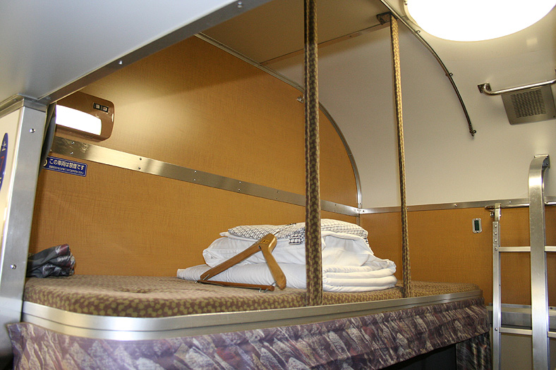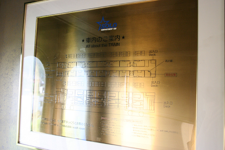 一人旅の強い味方、B個室「ソロ」。「なは」号に連結されているのはレール方向にベッドがセットされた、室数の多いタイプ。 各個室は上下2段に設定されたユニット構造で、全28室。偶数番号が2階個室で、奇数個室が1階個室になっています。 室内はほぼ一面がベッドスプレッドで覆われていて、寝て移動することに特化した個室構造。 このため、ベッドサイズが縦1,925mm×横幅1,000mmと、ベッド幅が破格の広さになっているのが特徴的です。 このタイプの「ソロ」に共通していえるのですが、1階個室よりも2階個室のほうが開放感があります。 2階個室の天井に向かって大きく湾曲する壁と窓には好みが分かれるところでしょうが、 1階個室は2階個室からの張り出しなどもあって、極端に室内が狭く感じられます。 通路から2階個室への階段は、隣り合う2室で共有するタイプ。 曲線でデザインしたステップと壁面に飾られた絵画が、リーズナブルな個室にはもったいないほどの優雅さを醸し出しています。 室内の枕元壁面にはコントロールパネル類が集約されて設置されています。 パネル内には電源用のコンセントが1つ用意されています。 おそらくは髭剃りシェーバー用の電源だと思うのですが、位置的にちょっと使いにくいです。 MacintoshのノートPCやボックスタイプのデジカメ充電器・携帯電話充電コードなど、特殊なカタチのプラグだと、 コンセントのまわりにある換気扇スイッチや室内灯スイッチに干渉されてしまって、プラグが完全に差し込めません。 この「ソロ」でPCやデジカメ・携帯電話の充電をする予定の方は、短くてもいいので延長コードをご用意されたほうがいいかも。 室内照明は、天井の蛍光灯(室内灯)のほかに枕元の読書灯と靴脱ぎのステップにある足元灯があります。 室内灯と読書灯はそれぞれ独立してオンオフが可能ですが、足元灯はスイッチがなく、消すことはできません。 |