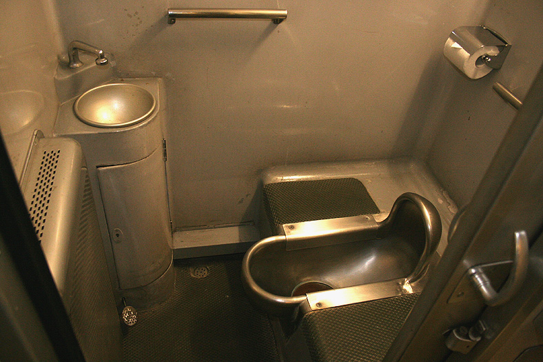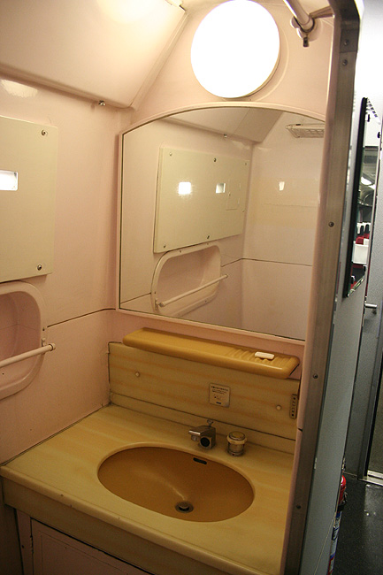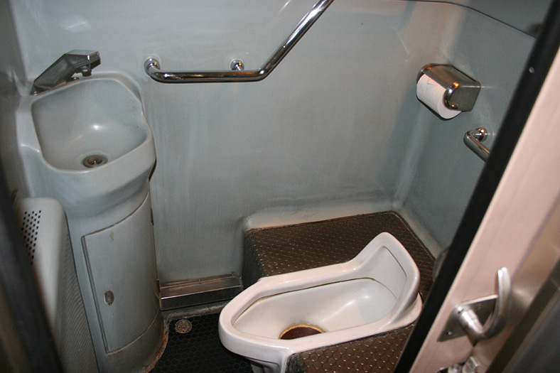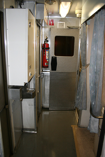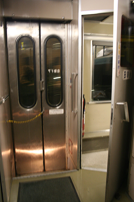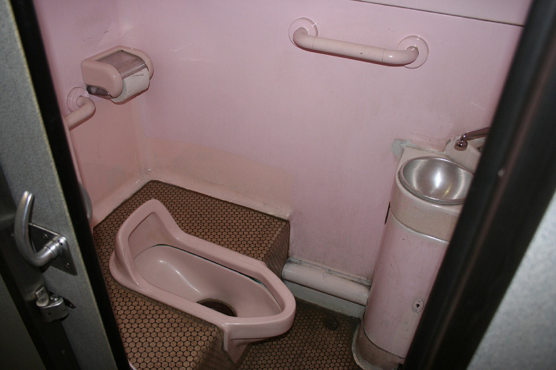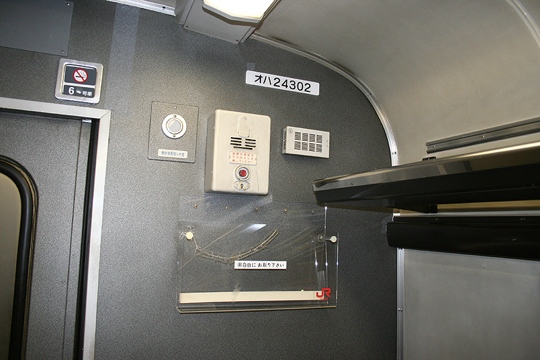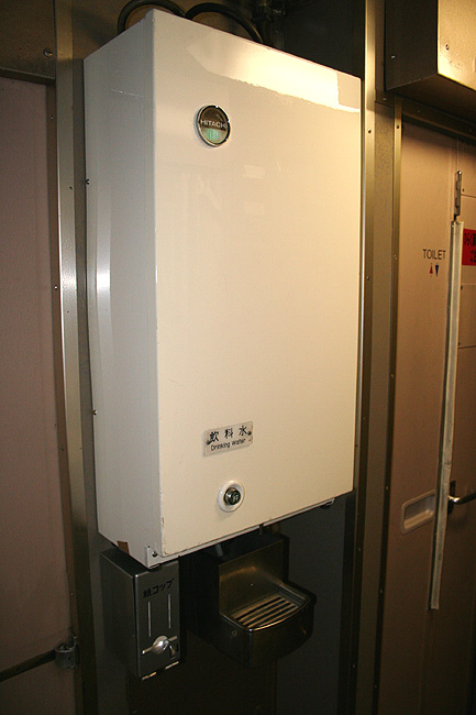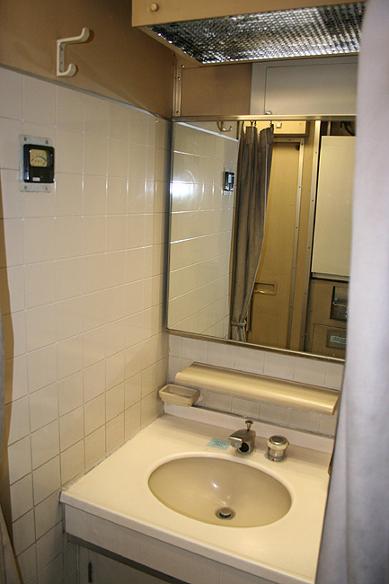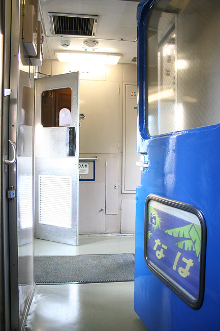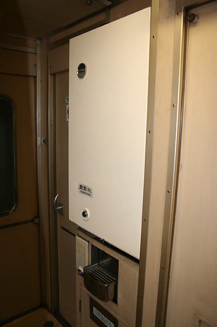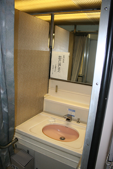 各寝台車両のサニタリーコーナーはリニューアル工事の手が入っていますが、佇まいは旧態依然といったところ。 いまや絶滅寸前の「冷水器」もほとんどの洗面台に設置されていて、元気に稼動中です。 レガートシート車は、洗面台・トイレともになぜかピンク系のカラーリングでリニューアルされています。 デッキは、こちらも国鉄時代からの寒々とした雰囲気が漂っています。 「オハネフ」車が貫通路側に連結されているところでは、貫通扉の「なは」のヘッドマークが間近に見られます。 |