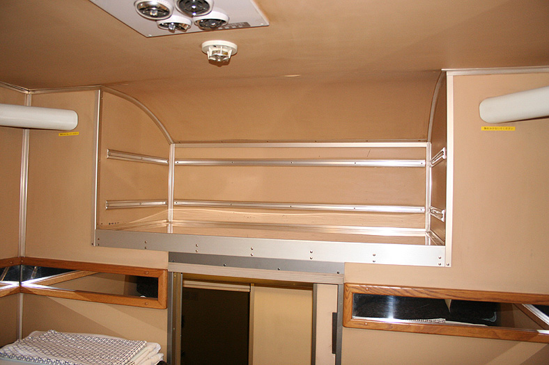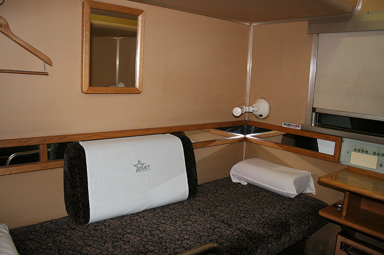 1991年に登場した「なは」専用の2人用B個室「デュエット」。 当時のJR九州ではブルートレインの利用活性化に向けた車両改造が盛んで、この車両もその1つ。 個室数は11部屋で、奇数番号が1階個室、偶数番号が2階個室になっています。 個室構造は、博多特急「あさかぜ」以来おなじみとなった「千鳥配置」構造。 ベッドの大きさは、縦1,925mm×横幅700mmで、寝台列車におけるいわば「レギュラーサイズ」 2階個室の階段部分では完全に立ち上がることができるので、着替えなどをするのにはラクです。 個室内の設備は1階・2階とも同等。 室内灯は「天井灯」「読書灯」のほか、足元壁側にデルタ形状を作っているバーが間接照明になっていて、 気分に応じて明るさの調節ができるようになっています。 テーブル側壁面のコントロールパネルではこれら室内照明のほか、エアコンの調節やアラーム・換気扇のオンオフ、 さらにトイレの使用状況が分かるランプなども搭載。ただ、登場当時にはあった、ミュージックパネルは撤去されてしまいました。 ちなみに、室内をグルッと囲んでいる木枠にはめられたオビ状のものはカガミ。 |