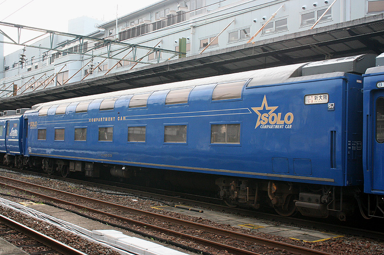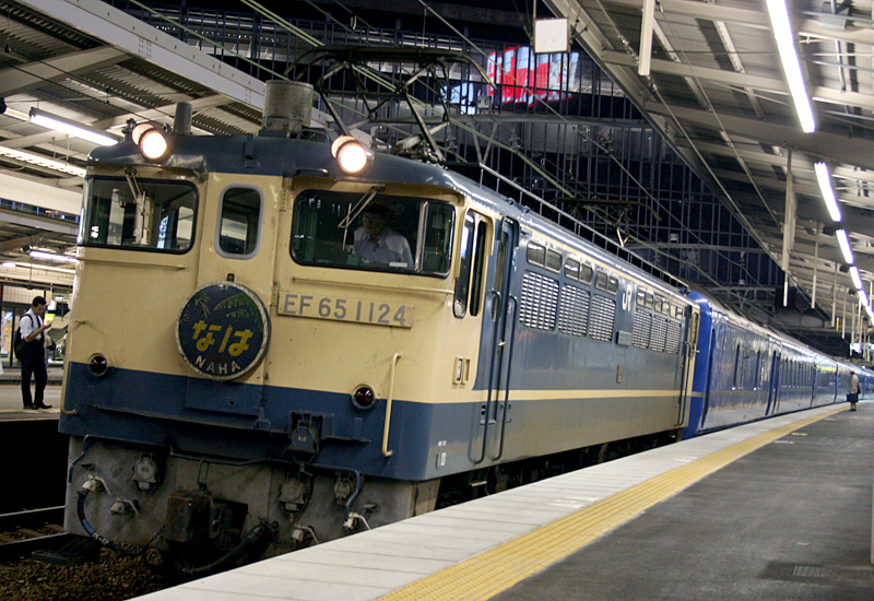 沖縄本土返還の願いを込められての命名。キハ82系気動車で運行。 1973年10月 「なは」はキハ82系から485系電車に車種を変更。 1975年3月 新大阪−西鹿児島間の寝台特急「あかつき」を「なは」に改称。 同年7月からの沖縄海洋博覧会開催に向けての愛称変更。581/583系で運行。 1984年2月 581/583系電車から24系客車に車種を変更。 1986年11月 「なは」の受け持ちが向日町運転所から鹿児島/熊本運転所に変更。 1990年3月 座席車「レガートシート」の連結を開始。 1991年3月 B寝台2人用個室「デュエット」の連結を開始。 1992年7月 B寝台1人用個室「ソロ」の連結を開始。 2004年3月 九州新幹線部分開業により、西鹿児島発着から熊本発着に変更。 2005年10月 「あかつき」との併結運転開始。京都発着に変更。 2008年3月 「なは」廃止。愛称誕生からちょうど40年で歴史に幕が下りる。 (撮影時期:2005年) |