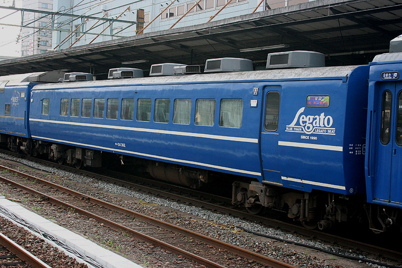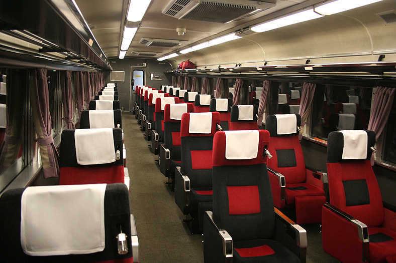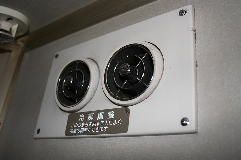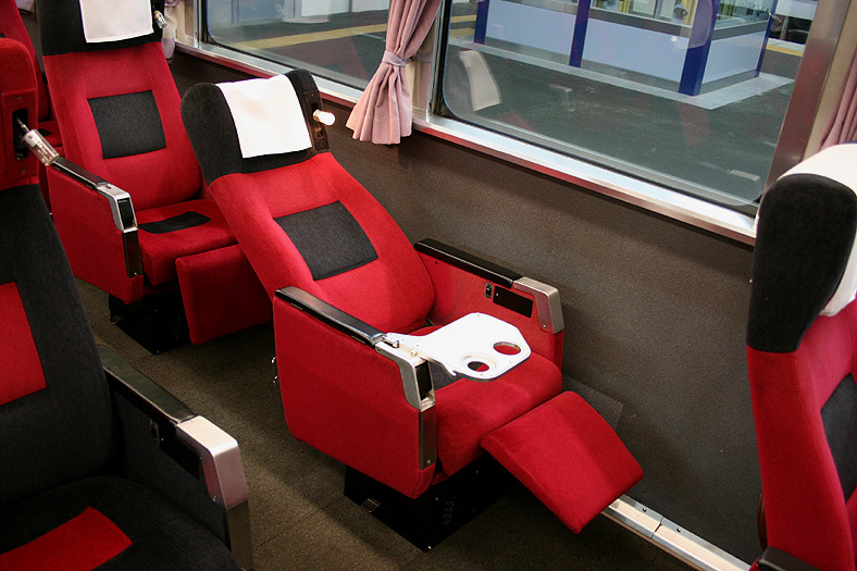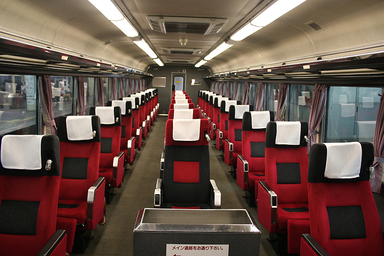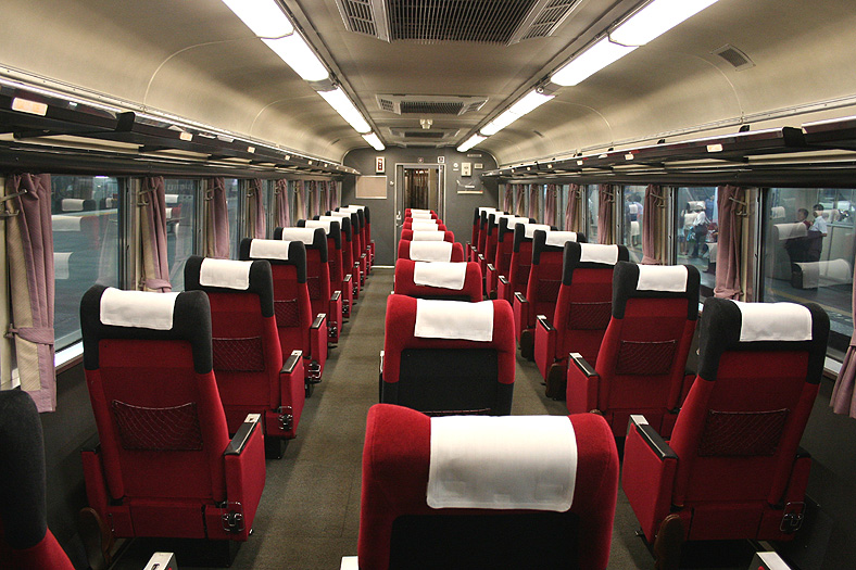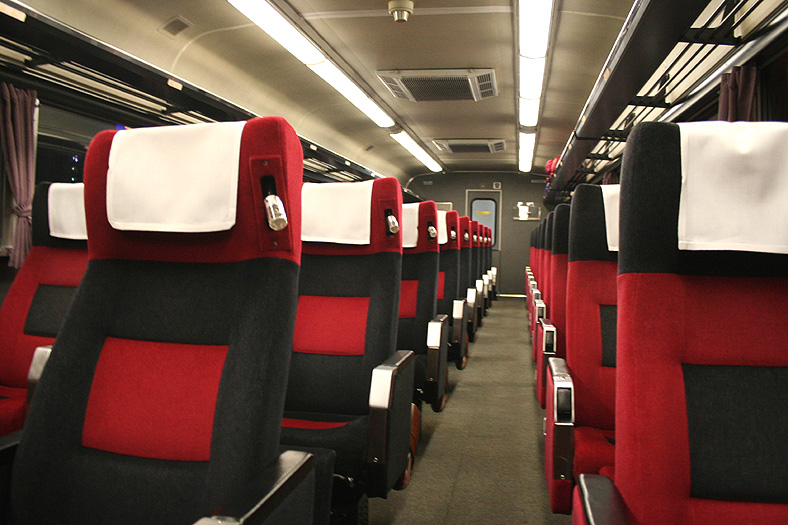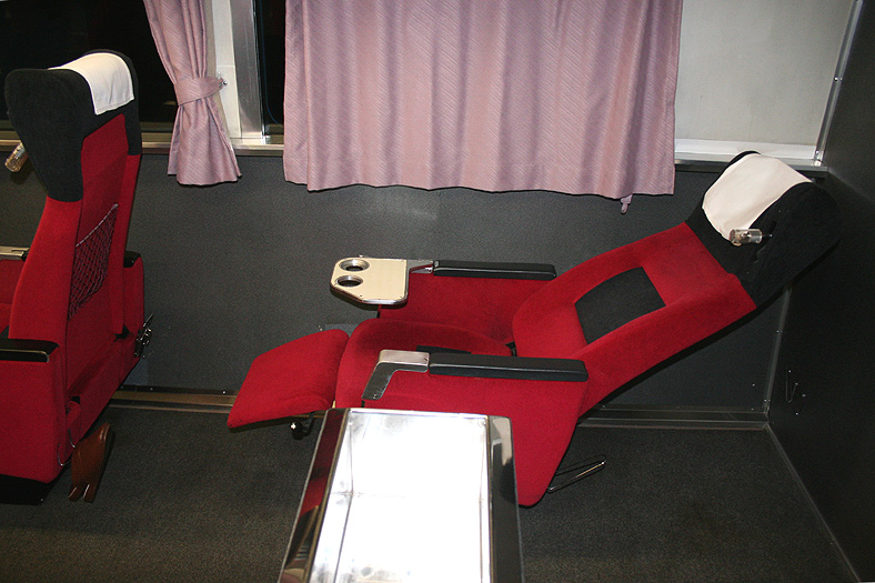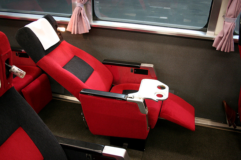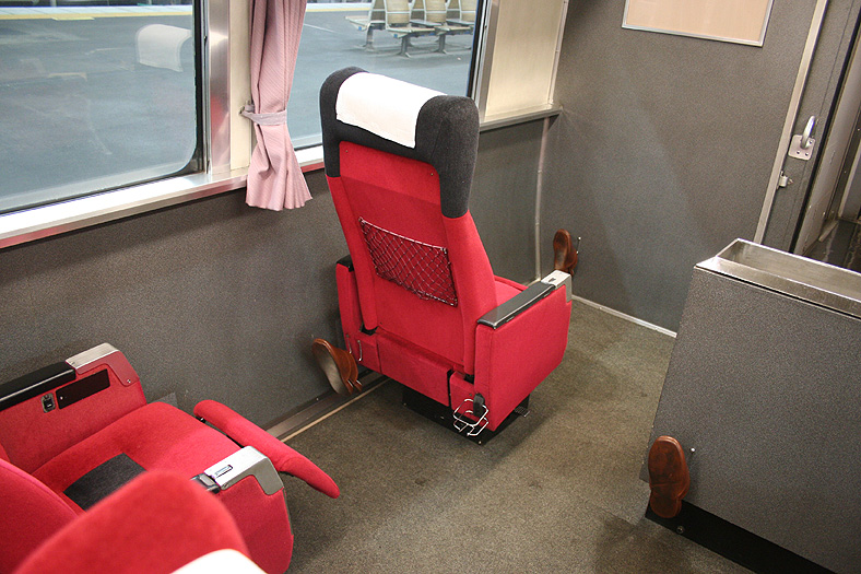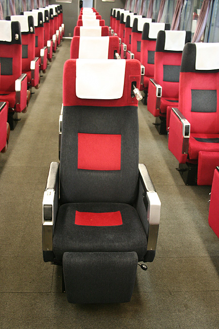この車両が誕生した頃、関西−九州は夜行高速バスが大流行の時代でした。 リーズナブルでそこそこ速い夜行バスを尻目に、ジリ貧状態に陥るJRブルートレイン。 そこでJR西日本とJR九州がタッグを組んで生み出したのが、この「レガートシート」車。 夜行バスをそっくりそのままブルトレに持ち込んだ、世にも不思議な「3列独立・超リクライニング」の普通車。 JR西日本は「あかつき」に、JR九州は「なは」にこの車両を投入して、特急料金だけで利用できる、破格のサービスを開始したのでした。 「寝て移動」が前提の座席なので、リクライニング量は60度。 とてつもなく奥底まで倒れる感じがしますが、実際に「寝る」体勢になってみると・・・あと10度ほど倒れてくれたらウレシイ。 足元にはレッグレストがあり、3段階でのストッパー機能付き。登場当初はオーディオパネルを装備していましたが、今は全席撤去済み。 アームレスト内側に見える黒いパネル上のものが、オーディオパネルを撤去した跡です。 読書灯はヘッドレスト部分に埋め込まれていて、使いたい時に引き出すようになっています。 スイッチはアームレストの内側にあり、手元でスイッチのオンオフが可能。 左右2本で貫通している通路ですが、ちゃんと「メイン通路」が設定されています。 この車両を通り抜ける時は「メイン」のほうを使いましょう。ちなみに「メイン通路」の幅は520mm、もう片方の通路幅は450mm。 |