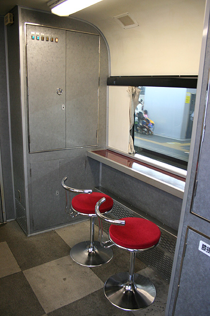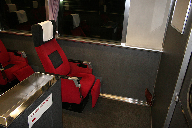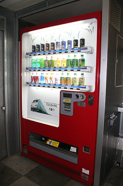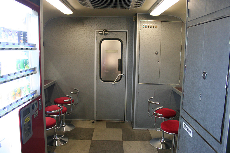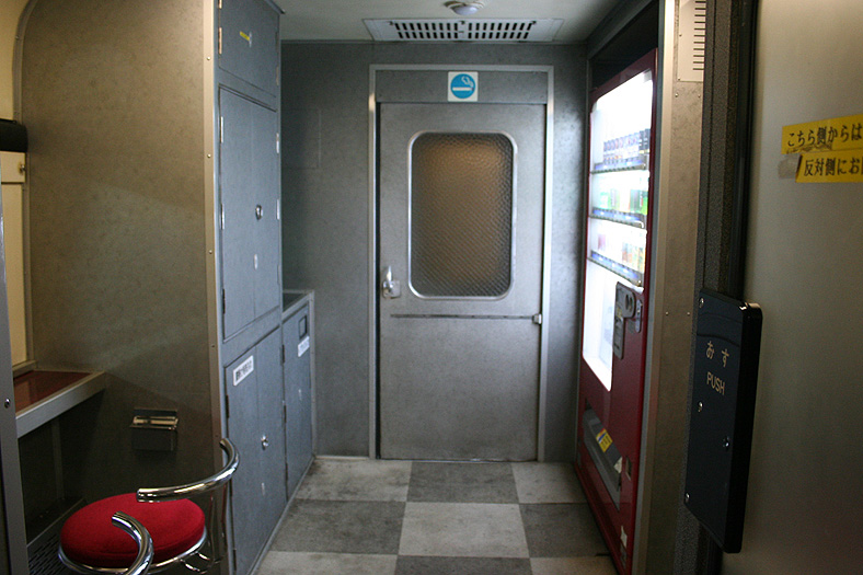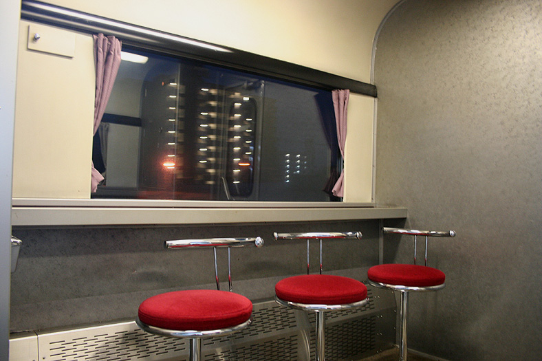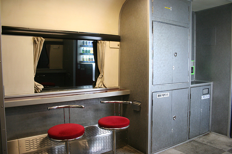 レガートシート車の車端部(デュエット車側)には、ロビーコーナーが設けられています。 貴重なフリースペースで、スツールとカウンターがあり、ちょっとした「バー」のような雰囲気。 登場初期は無料で使えるティーサーバーが完備されていましたが、現在は飲料自販機が設置されています。 |