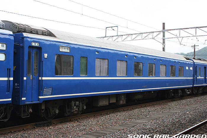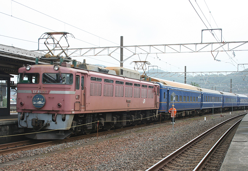 1968年10月 「日本海」は夜行急行から寝台特急に格上げ。 1975年3月 湖西線経由に変更。車種が14系寝台客車に変更。2往復に増発。 1982年11月 車種を2往復とも24系25形に変更。A寝台車の連結を廃止。 1988年3月 1・4号がJR西日本受け持ちになり大阪−函館間に運転区間変更。 3・2号はJR東日本の受け持ちになりA寝台の連結を再開。 1998年12月 1・4号にA個室寝台「シングルDX」の連結を開始。 2006年3月 1・4号の運転区間を大阪−青森に変更。青函トンネル区間の運行を廃止。 2008年3月 2・3号が廃止。JR東日本受け持ちで1往復の運転を継続。 2012年3月 「日本海」の定期運用を終了。以後、多客時の臨時列車として運転。 2013年1月 臨時運転を終了。「日本海」実質的に廃止。63年の歴史に幕。 (撮影時期:2010年) |