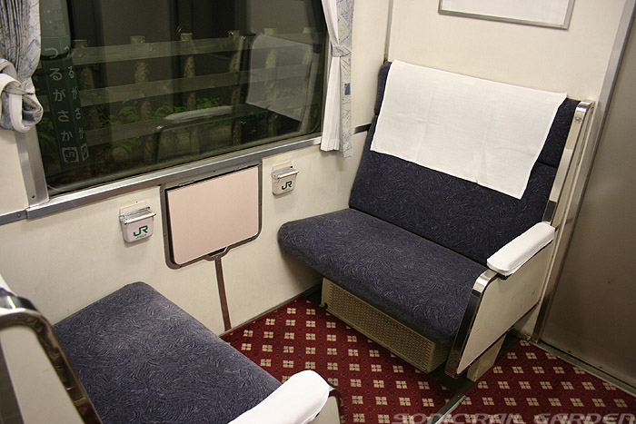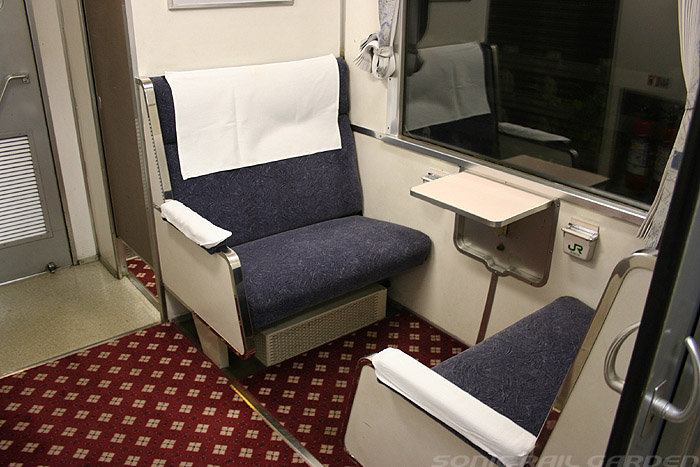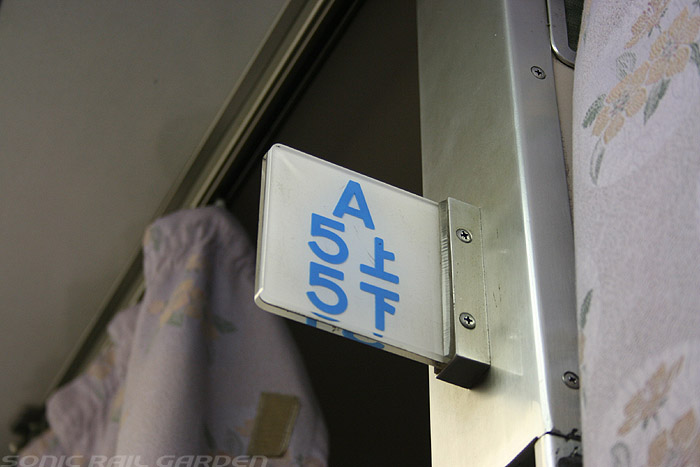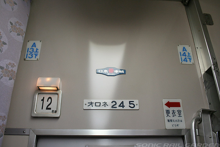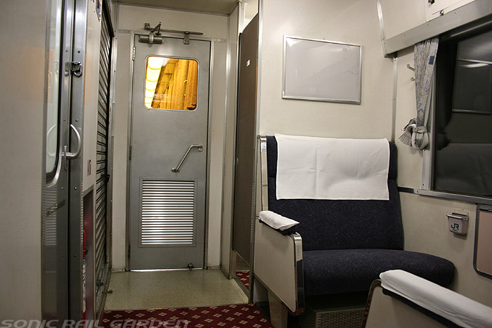 編成中に1両だけ、青森方の一番端っこになる12号車に「A寝台」車が連結されています。 現在までに残った寝台特急の「A寝台」は全て個室であるのに対して、「日本海」号のこの「A寝台」は開放型寝台。 通路を中央に配して、その両脇に寝台を設置した「プルマン式」と呼ばれるタイプです。 寝台は全て、上段と下段の2段式。 寝台サイズは下段が、幅が約1,000mm・長さが1,900mm・高さ約1,200mm。上段は幅が約900m・長さが1,900mm・高さが約1,000mm。 下段寝台はやはり一番人気。 通路からすぐに自分の寝台へと入れる手軽さと、やっぱり、大きな窓を独り占めできるのが人気の所以です。 寝台内での、寝台面から上段の天板までの高さが約1,200mmを余裕があるので、あぐらをかいた姿勢で座ることができます。 窓の下には折り畳みテーブルが収納されていますが、敷布団をちょっとずらせばこのテーブルを簡単に引き出せます。 テーブルはけっこう大きめなので、車内に持ち込んだ食料品や雑誌、小物などを置いておくのに便利。 上段寝台へは通路からハシゴを上って入ります。ちょっとした「隔離空間」的な感じ。 寝台内の天井は壁側が丸くカーブしているので、寝台空間内も独特な雰囲気です。 窓はごく小さな小窓がついているだけで、寝台内からの外界への眺望はほとんど望めません。 テーブルなども無いので、下段に比べて物置も少なく、起きている時間帯の居住性はあまり良くありません。 一方、就寝時間帯ですと、通路を行き交う人の足音や床下から伝わる列車の走行音や振動が下段に比べてかなり軽減されるので、 熟睡するには、下段よりも上段寝台の方が良い環境といえます。 A寝台の乗客に用意されているアメニティは、ハンガーと浴衣が各寝台に、スリッパが通路に準備されています。 ハンガーが服を掛けた状態では、下段では服が完全に吊るされた状態になりますが、上段では服の下方が寝台面にやや引っ掛かります。 浴衣は昔から寝台列車でサービスされていた古めかしいスタイルのもの。 スリッパも昔ながらのビニール製のもので、歩くとペタンペタンと足音がします。 このほか、寝台内の設備としては、上段・下段とも蛍光灯の読書灯が設置されています。 A寝台車両はデッキ側に乗客の共用空間として、対面のボックス座席と着替え室があります。 ボックス席はA寝台専用のちょっとしたサロンスペース。ここは喫煙スペースとなっていて、座席袖部分に灰皿が設置されています。 着替え室は中がカーペット敷きで、ちゃんとしたフィッティングルーム仕様。もちろん内側からロックすることができます。 |