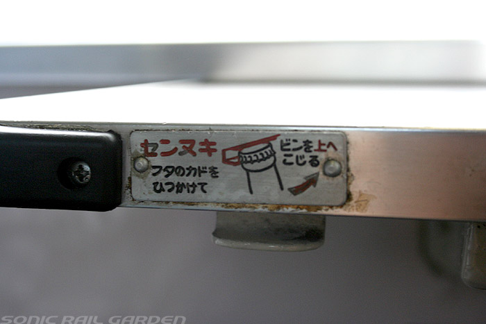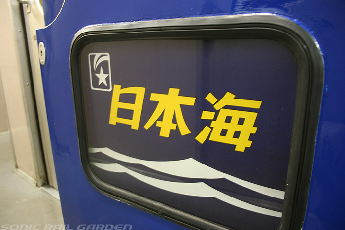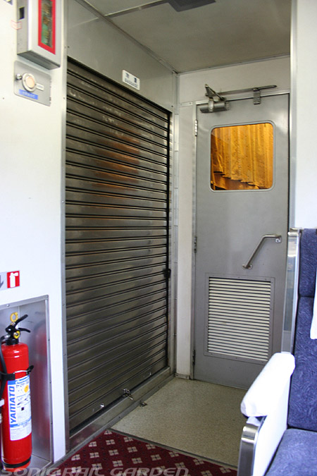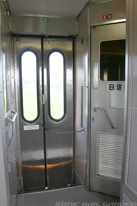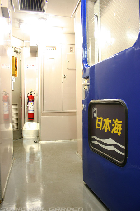 デッキはいずれの車両も昔から変わらぬ、ステンレスがギラつく飾り気の無い空間。 機械盤の空きスペースを活用したのであろう「くずもの入れ」も昔ながらのままです。 一部のB寝台車には「更衣室」が設置されています。扉つきで、簡単な踏み台とカガミが設置されています。 車掌室が設置されている車両が編成の中間に入っている場合、「日本海」のマークを間近に見ることができる場合があります。 「日本海」号には飲料の自動販売機は設置されていません。 車内販売も上り列車の朝方に一部区間であるだけで、基本的に車内で飲食物を購入することができません。 乗車前には、ちょっと多めに飲み物と食べ物を手に入れておくことをオススメします。 |