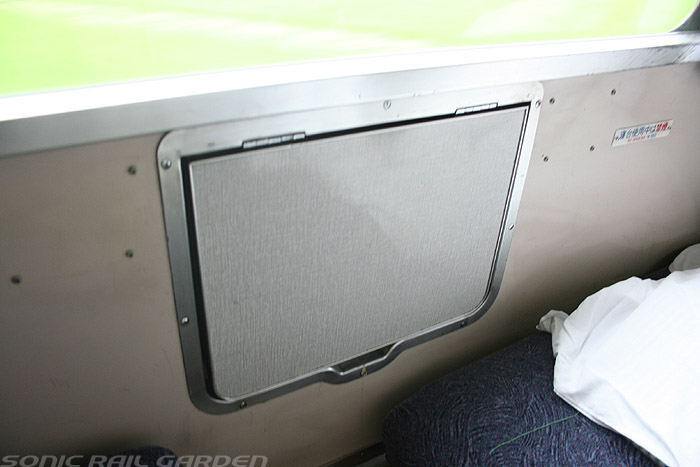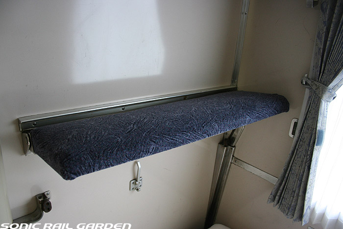 下段寝台の両脇にある小さな棚。 | これも本来は、ボックス席にした際の昼行仕様でヘッドレストとなる部分。 ボストンバッグやリュックサックぐらいの大きさなら、置くことができる。 ![]()