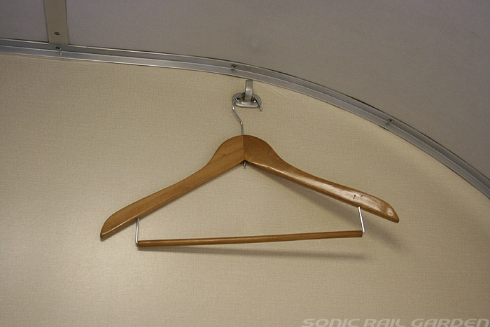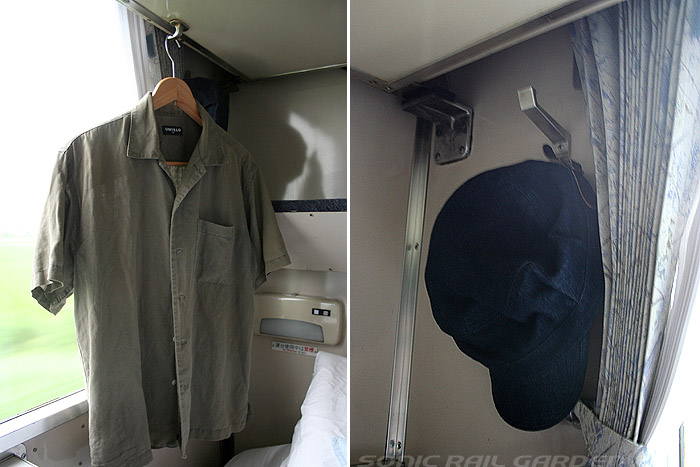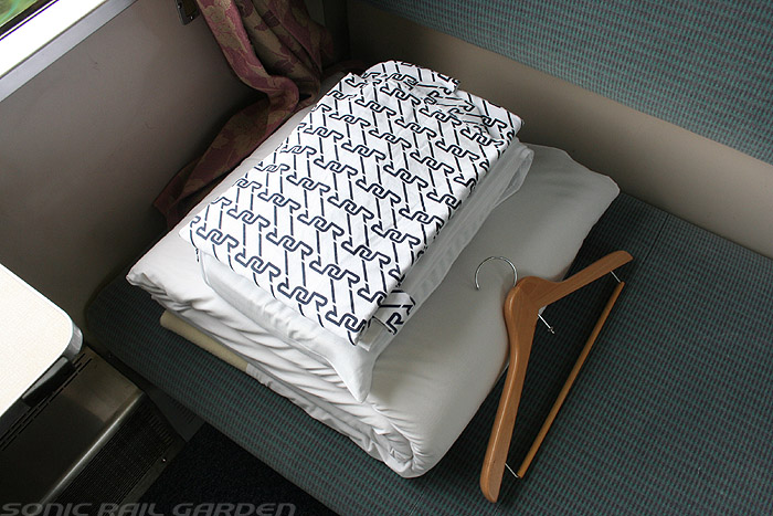 A寝台の乗客にサービスされるアメニティは浴衣とハンガー。 | 残念ながら洗面キットなどは提供されない。 ![]()
