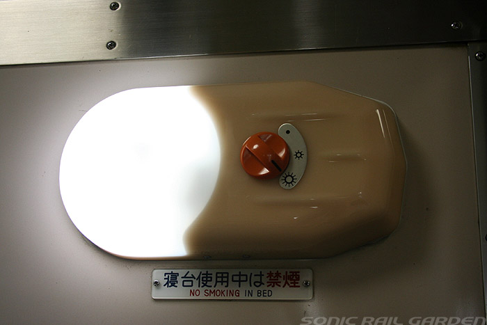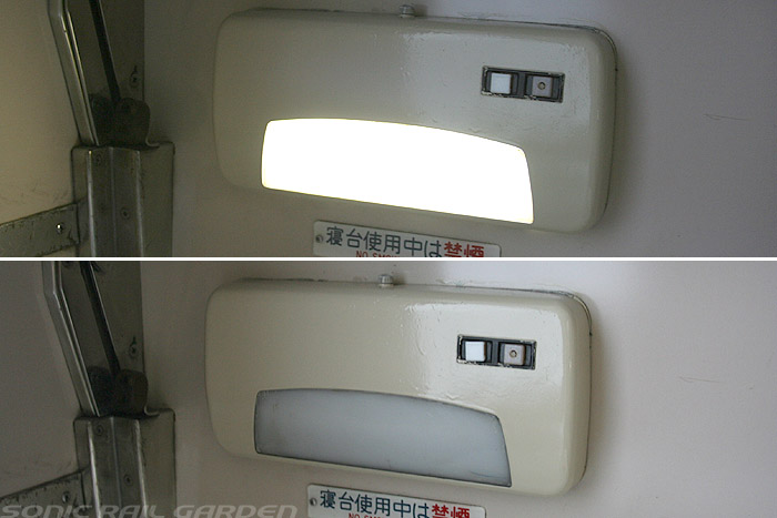 寝台内の照明はこの読書灯のみ。カバー付き蛍光灯でON/OFFの2ウェイ。 | 就寝時間帯に通路が一斉に減光されると寝台内はかなり暗くなり、 この読書灯でも明るさはあまり充分とはいえない。 ![]()