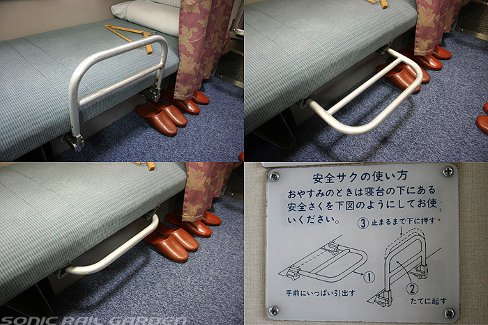 下段寝台の転落防止柵は、折り畳んで寝台下へと収納が可能。 | ![]()