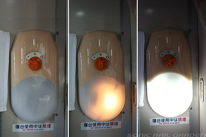 寝台内の読書灯はいくつかのタイプがあるが、これが一番オーソドックスなタイプ。 | 消灯・豆電球・蛍光灯の3ウェイでの利用ができる。 ![]()