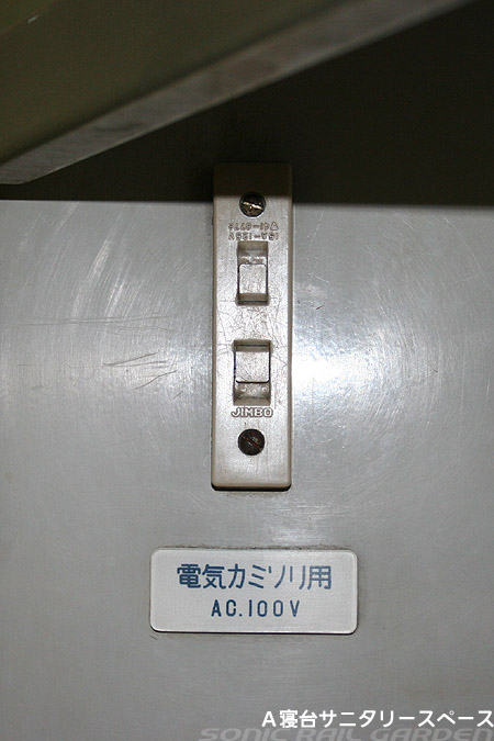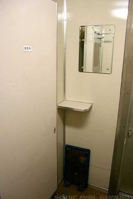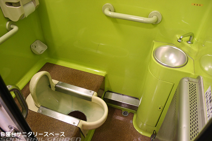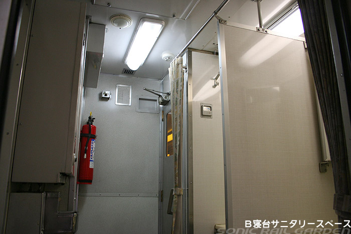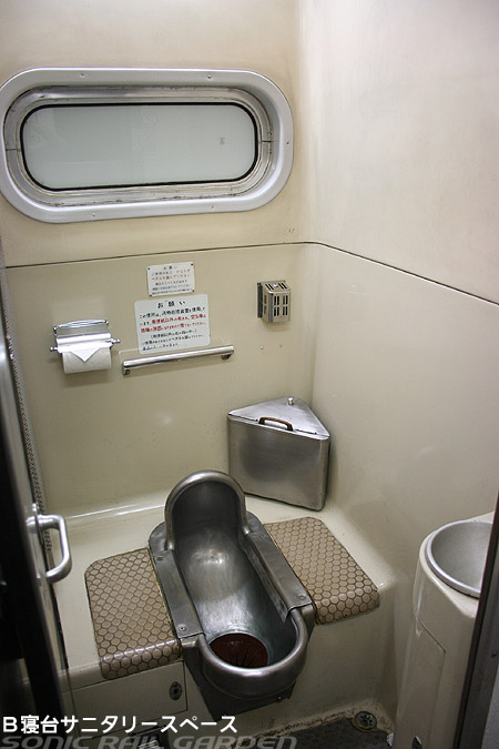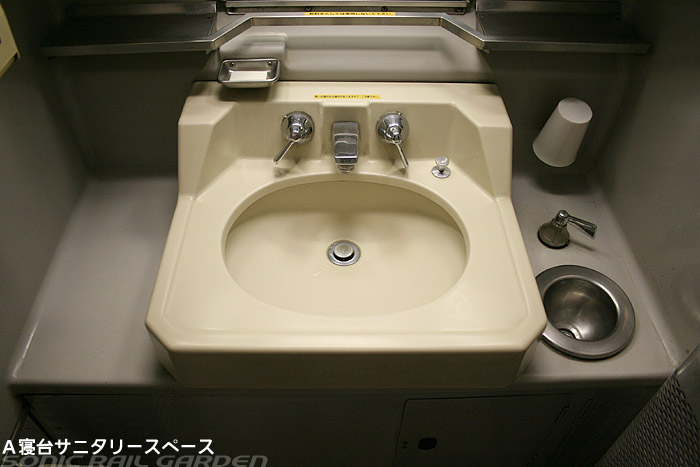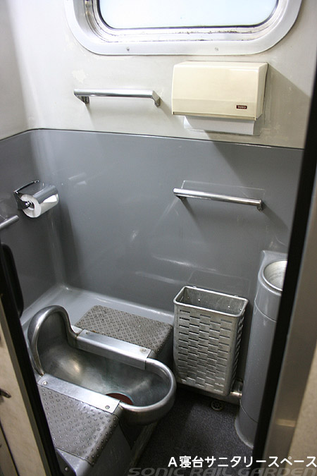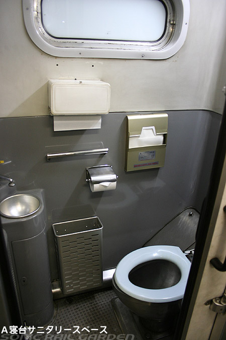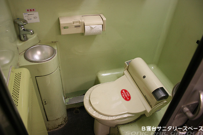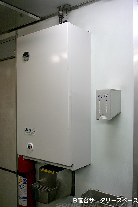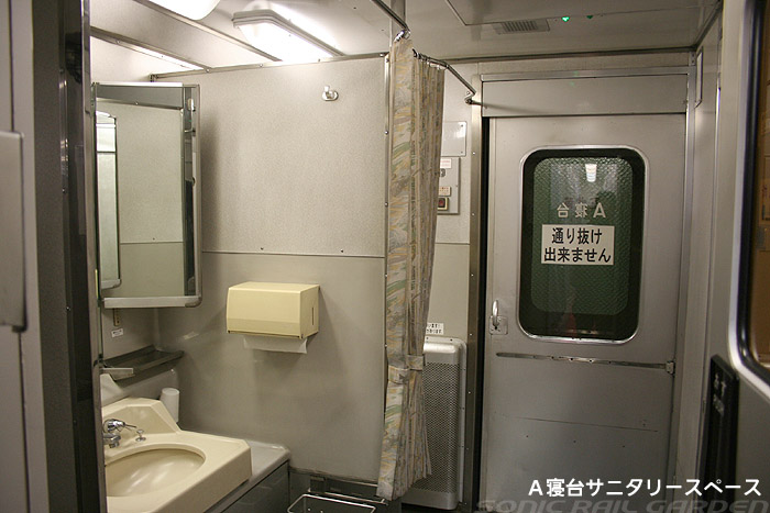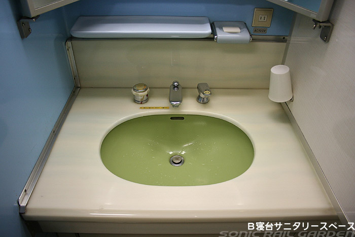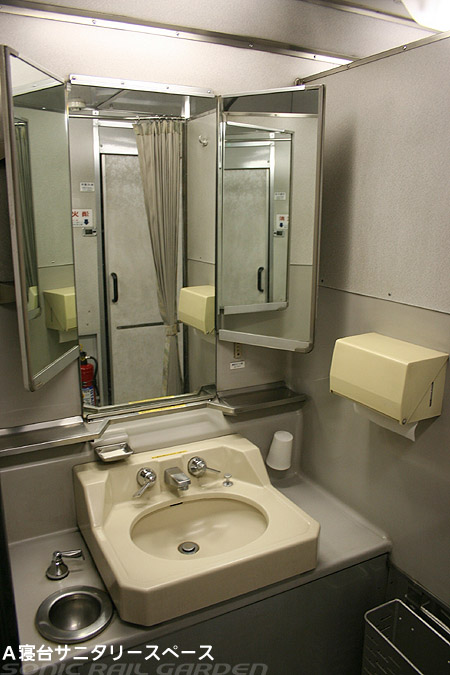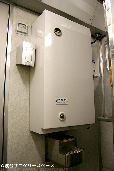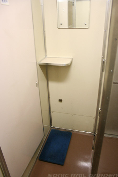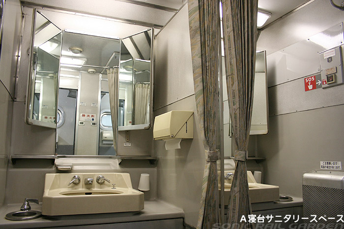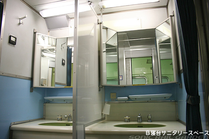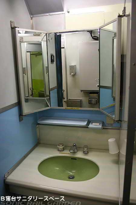 サニタリースペースは全ての車両に完備されています。 「A寝台車」は、編成の行き止まりとなる電源車側にサニタリースペースがあり、実質的にA寝台客専用のスペース。 2つの洗面台と、和式個室・洋式個室、飲用の給水機が設置されています。 いずれの設備も素材むき出しの感が強く、昭和時代に好まれたのであろう「清潔感」が漂う雰囲気。 B寝台車のサニタリースペースは、基本設備は共通ながら、リニューアルが施されていたりいなかったりで各車で様子が異なっています。 基本的にトイレは和式個室ですが、ごく一部の車両には洋式トイレに改造されていたりします。 洗面台は水温調節が可能で、コックを押すと一定時間給水される蛇口が設置されています。 洗面台のカガミ下のコンセントは電気シェーバー用。寝台内にコンセントが無いので、現在では携帯電話の充電に大活躍。 乗車した列車では、B寝台全てのサニタリースペースに飲用の給水機が設置されていて、全機が稼動中でした。 |
