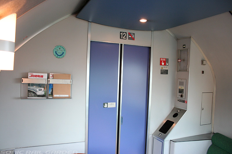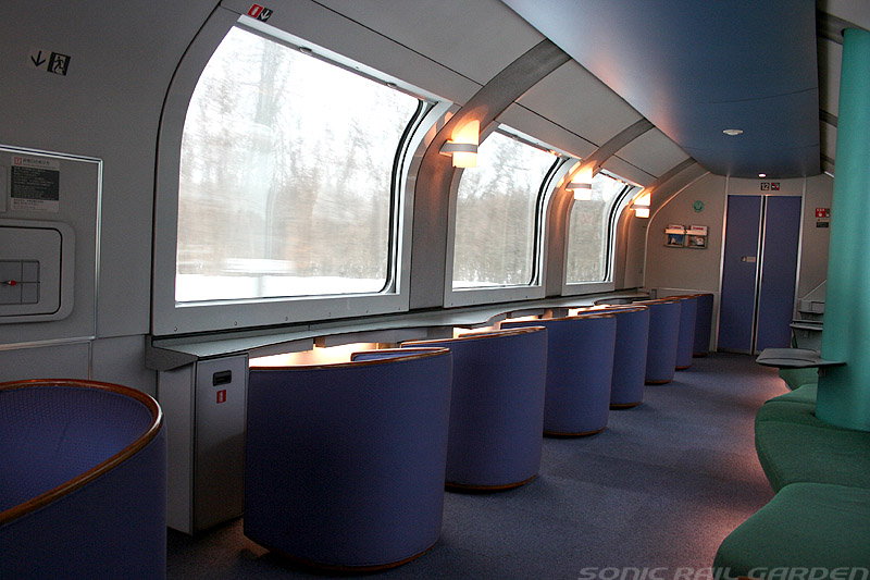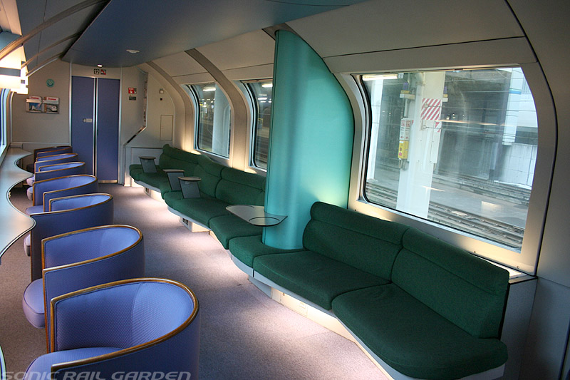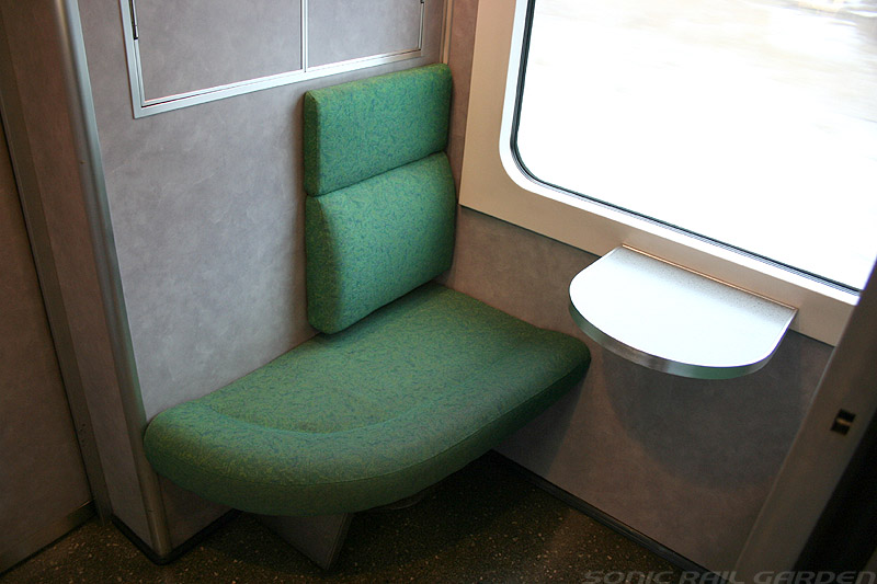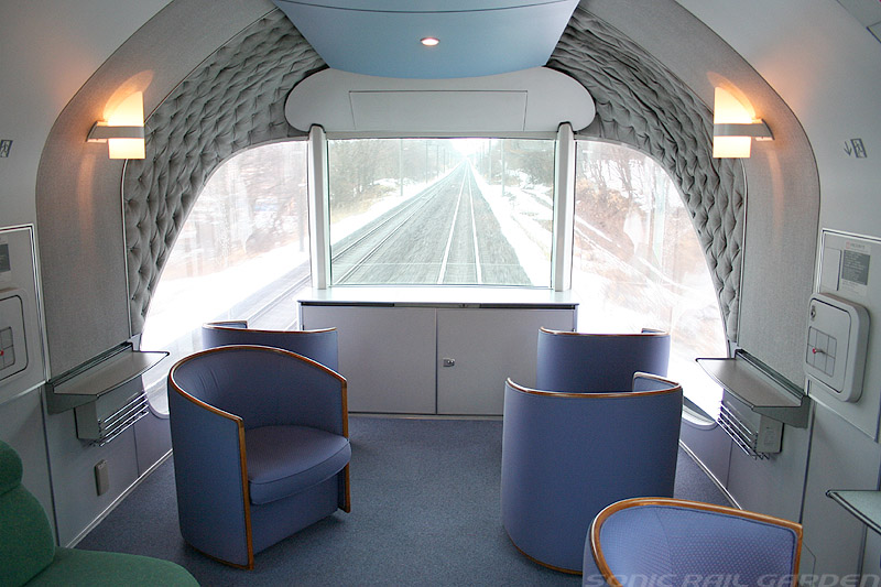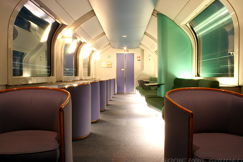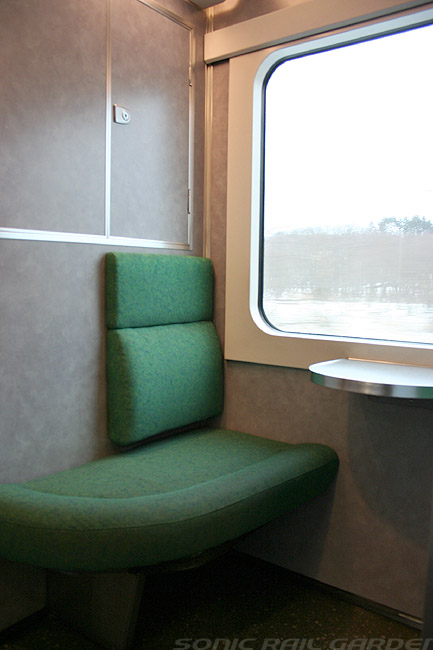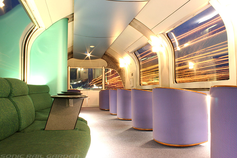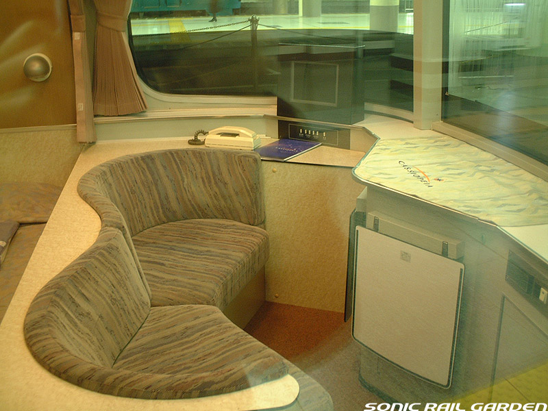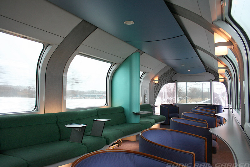 長距離を走る豪華寝台特急の長旅に、息抜きの場として、語らいの場として必要不可欠なフリースペース。 「カシオペア」では、編成の札幌方末端の12号車に「ラウンジカー」を連結しています。 グリーンとブルーのソファーに、天井もブルー。色調がメタリックな感じなので、未来的・宇宙感覚が漂う雰囲気です。 一人掛けの回転ソファーが11脚と、ウェーブ形状にデザインされた長いソファー。座ると基本的に太平洋側を向くようになっています。 一番奥は展望タイプになっていて、回転ソファーが4脚。曲面ガラスがはめ込まれていて、側面の窓は足元までガラス張り。 下りの札幌行きでは機関車と対面になりますが、上りの上野行きでは最後尾となるので、誰でも展望パノラマが楽しめます。 室内には、始発駅出発から終点到着までクラシック音楽がBGMとして流されています。 ラウンジ室の入り口脇には自動販売機とカード式公衆電話が設置されているほか、デッキ部分には売店スペースも。 食堂車の営業時間内でここの売店もオープンしていて、車内販売で扱っている商品を購入することができます。 ラウンジカーの床下には、「カシオペア」の全ての電気を賄う発電機関スペースとなっています。 床下からは常に発電機が動いている音が聞こえてくるので、まるでディーデルカーに乗っているような感覚になります。 この「ラウンジカー兼電源車」は検査で編成を離脱することがあり、その時はラウンジスペースの無い純粋な電源車が連結されます。 12号車のラウンジカーのほか、5号車と9号車には対面ソファーを設置したミニロビースペースがあります。 ミニロビースペースには飲料の自動販売機も設置されています。 |