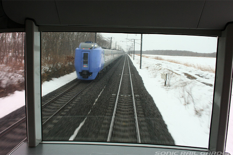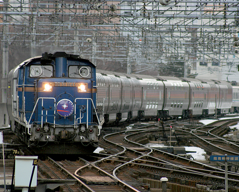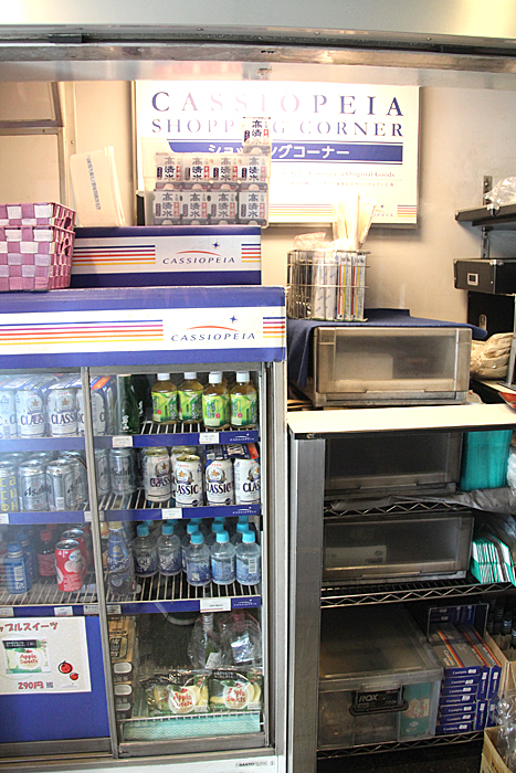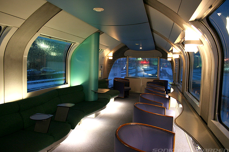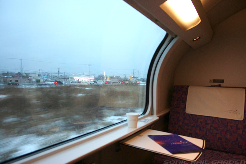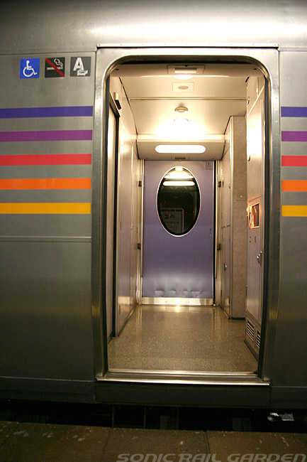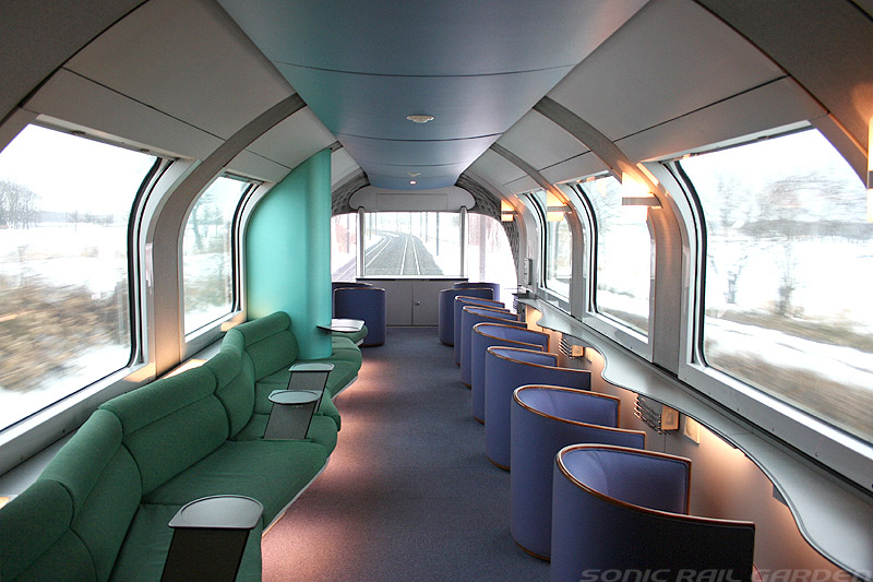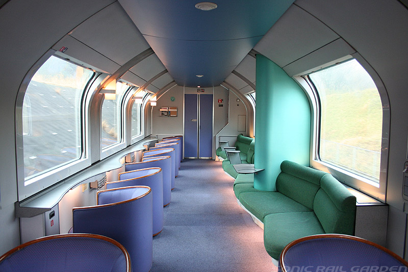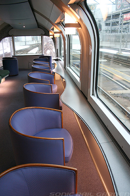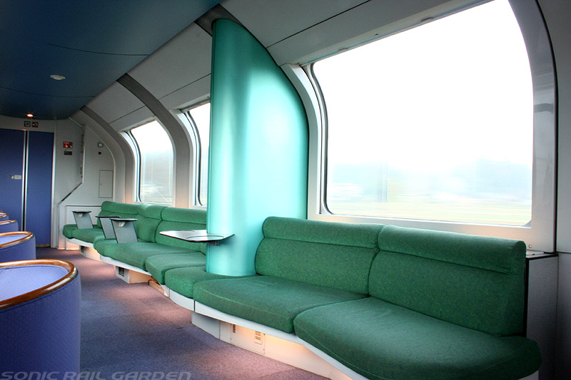 長距離を走る豪華寝台特急の長旅に、息抜きの場として、語らいの場として必要不可欠なフリースペース。 「カシオペア」では、編成の札幌方末端の12号車に「ラウンジカー」を連結しています。 グリーンとブルーのソファーに、天井もブルー。色調がメタリックな感じなので、未来的・宇宙感覚が漂う雰囲気です。 一人掛けの回転ソファーが11脚と、ウェーブ形状にデザインされた長いソファー。座ると基本的に太平洋側を向くようになっています。 一番奥は展望タイプになっていて、回転ソファーが4脚。曲面ガラスがはめ込まれていて、側面の窓は足元までガラス張り。 下りの札幌行きでは機関車と対面になりますが、上りの上野行きでは最後尾となるので、誰でも展望パノラマが楽しめます。 室内には、始発駅出発から終点到着までクラシック音楽がBGMとして流されています。 ラウンジ室の入り口脇には自動販売機とカード式公衆電話が設置されているほか、デッキ部分には売店スペースも。 食堂車の営業時間内でここの売店もオープンしていて、車内販売で扱っている商品を購入することができます。 ラウンジカーの床下には、「カシオペア」の全ての電気を賄う発電機関スペースとなっています。 床下からは常に発電機が動いている音が聞こえてくるので、まるでディーデルカーに乗っているような感覚になります。 この「ラウンジカー兼電源車」は検査で編成を離脱することがあり、その時はラウンジスペースの無い純粋な電源車が連結されます。 12号車のラウンジカーのほか、5号車と9号車には対面ソファーを設置したミニロビースペースがあります。 ミニロビースペースには飲料の自動販売機も設置されています。 |