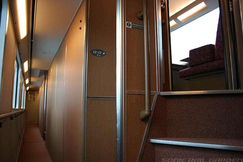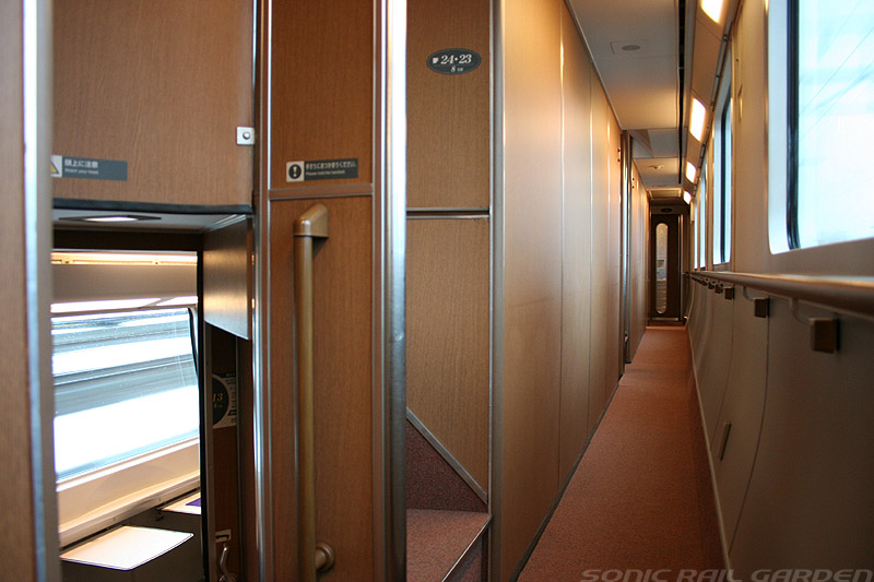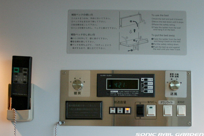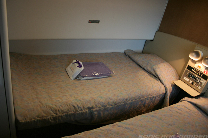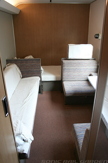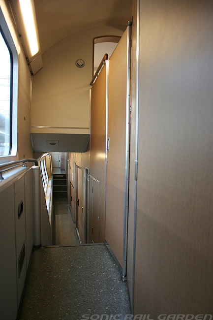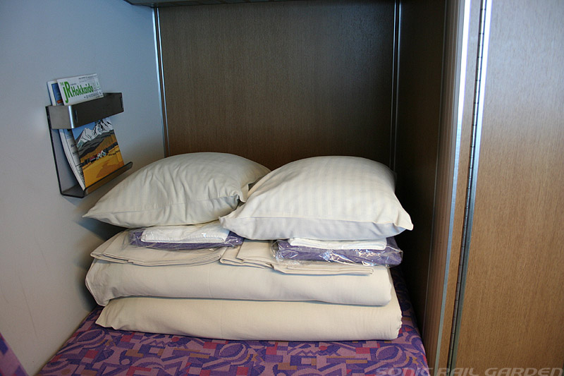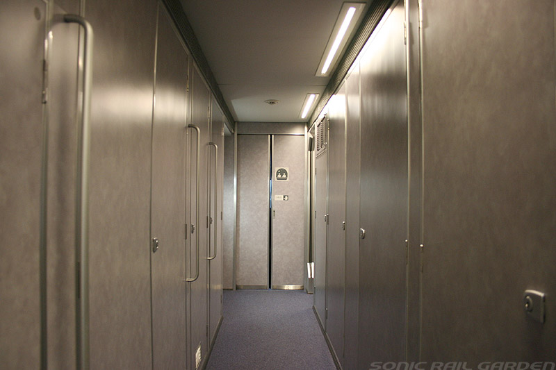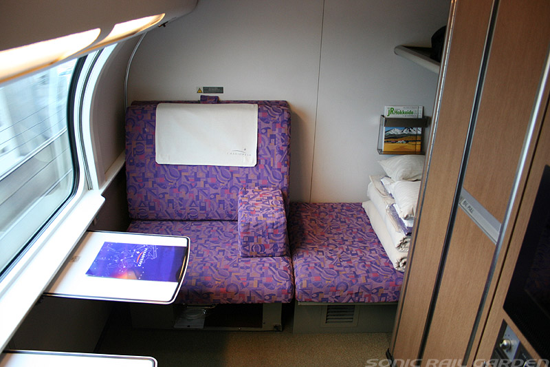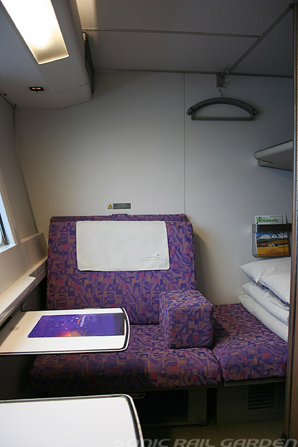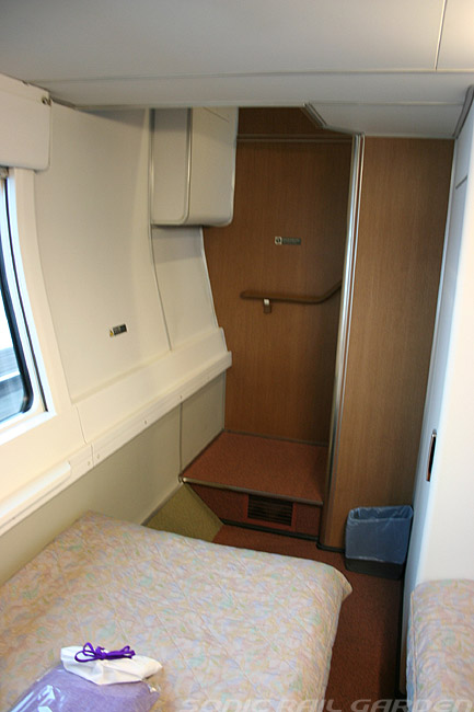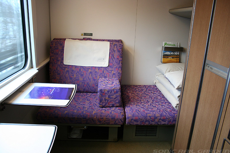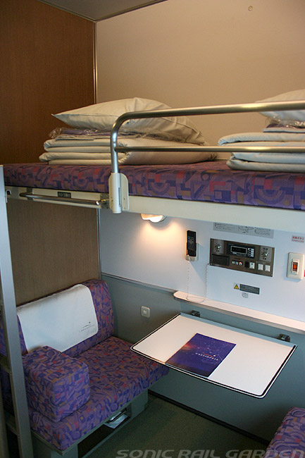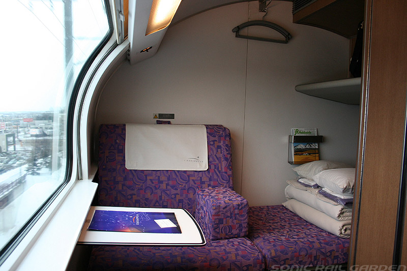 「カシオペア」の中で最も数が多く設定されている個室が「カシオペアツイン」です。 1編成あたり79室が設けられていますが、「カシオペアツイン」はB寝台個室ではなく、A寝台個室のランク付け。 「カシオペア」は全個室がA寝台クラスとなっていて、B寝台の設定がない日本初の「オールA寝台個室」の列車です。 「カシオペアツイン」は部屋の設定位置や個室内の設備によって、4タイプの部屋があります。 2階建て部分の2階にある「2階タイプ」、その1階部分にある「階下タイプ」、車端部にある「平屋タイプ」。 さらに「平屋タイプ」にはエキストラベッドを備えて3人での利用ができる「トリプルルームタイプ」もあります。 各部屋タイプとも室内の設備は共通で、2脚のソファにトイレ・洗面ユニット、液晶テレビにBGM装置などを備えています。 ソファは座面を中央へスライドさせて背もたれを倒すとベッドになり、室内にL字型に2台のベッドがセットされるような仕組み。 寝具類はあらかじめ荷物棚の下に折り畳まれてセットされていて、ベッドメイキングは乗客自身で行うようになっています。 ベッドを組み立てる説明書きが室内に置かれていますが、意外と簡単に、力を必要とせずにあっという間にベッド転換が可能。 部屋の広さは各タイプとも同じ面積で、約2,700mm×2,000mm。 天井の高さは、2階が最大クリアランスで約1,850mm、1階は1,820mm、平屋部分は2,000mm。 2階ほうが1階より若干高いのは最大部分の数値で、2階室は天井が湾曲しているので、実際には1階のほうがゆとりがあります。 ベッドサイズは窓面側が約1,920mm×800mm、奥の枕木方向側が1,950mm×800mm。 A個室ということで、全室にウェルカムドリンクとモーニングコーヒー、朝刊のサービスがあります。 ウェルカムドリンクはソフトドリンクのみで、ウーロン茶かオレンジジュースからの選択。 モーニングコーヒーはチケット制で、食堂車での朝食時か車内販売、もしくはラウンジカーで券と引き換えるスタイル。 朝刊は個室ドアの入り口に、ビニル袋に入れられてドアノブに引っ掛けたかたちで配布されます。 |