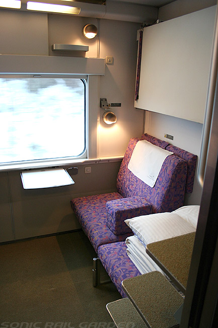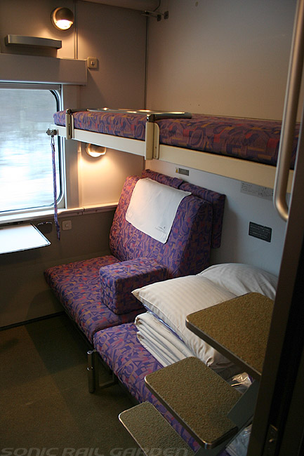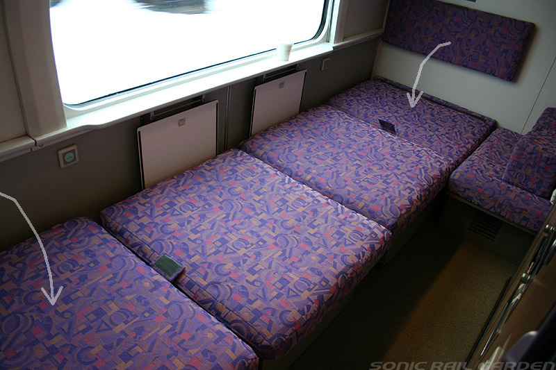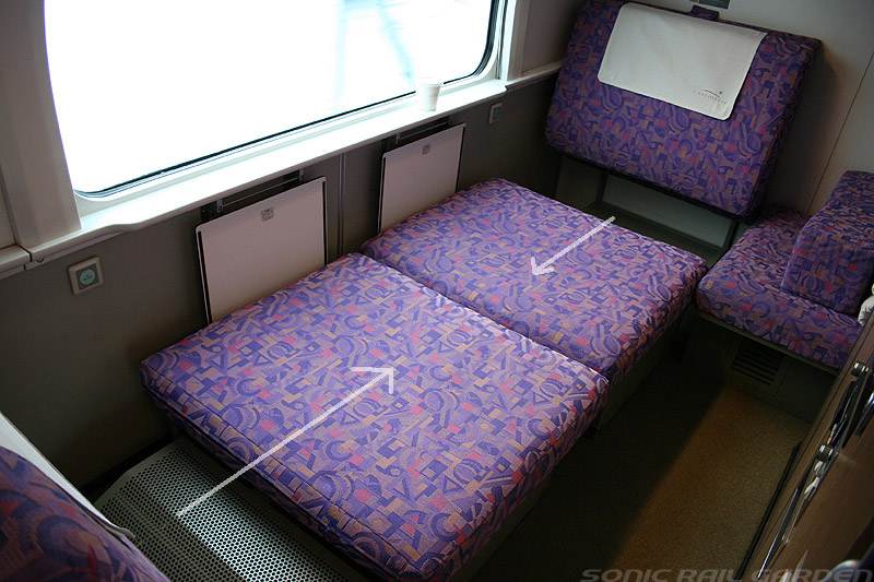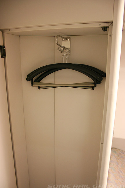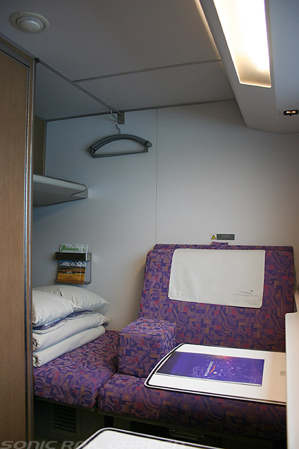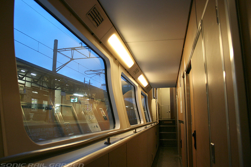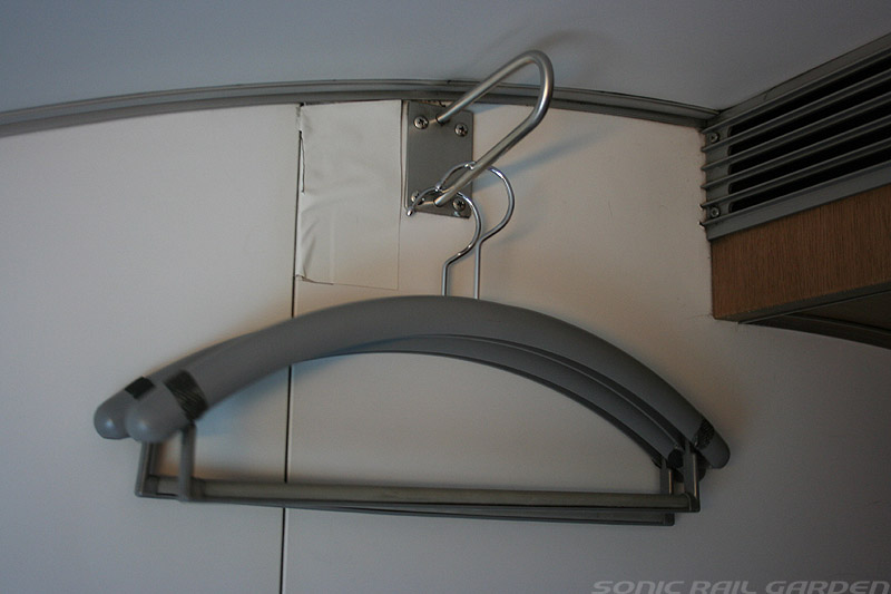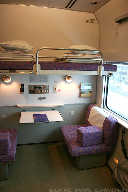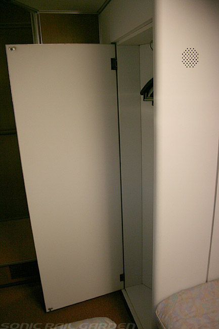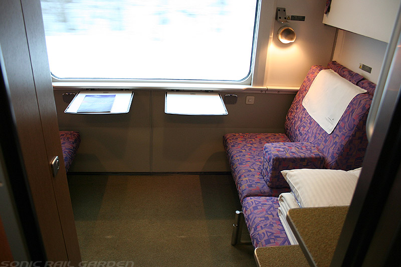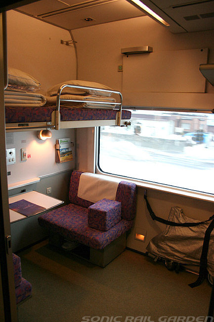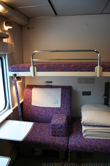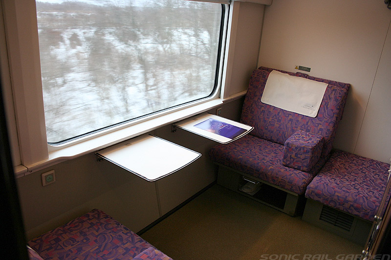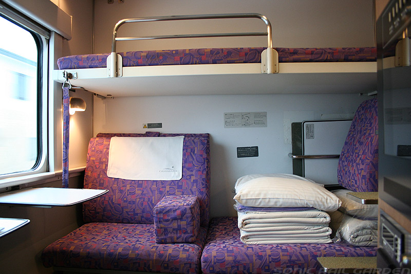 「カシオペア」の中で最も数が多く設定されている個室が「カシオペアツイン」です。 1編成あたり79室が設けられていますが、「カシオペアツイン」はB寝台個室ではなく、A寝台個室のランク付け。 「カシオペア」は全個室がA寝台クラスとなっていて、B寝台の設定がない日本初の「オールA寝台個室」の列車です。 「カシオペアツイン」は部屋の設定位置や個室内の設備によって、4タイプの部屋があります。 2階建て部分の2階にある「2階タイプ」、その1階部分にある「階下タイプ」、車端部にある「平屋タイプ」。 さらに「平屋タイプ」にはエキストラベッドを備えて3人での利用ができる「トリプルルームタイプ」もあります。 各部屋タイプとも室内の設備は共通で、2脚のソファにトイレ・洗面ユニット、液晶テレビにBGM装置などを備えています。 ソファは座面を中央へスライドさせて背もたれを倒すとベッドになり、室内にL字型に2台のベッドがセットされるような仕組み。 寝具類はあらかじめ荷物棚の下に折り畳まれてセットされていて、ベッドメイキングは乗客自身で行うようになっています。 ベッドを組み立てる説明書きが室内に置かれていますが、意外と簡単に、力を必要とせずにあっという間にベッド転換が可能。 部屋の広さは各タイプとも同じ面積で、約2,700mm×2,000mm。 天井の高さは、2階が最大クリアランスで約1,850mm、1階は1,820mm、平屋部分は2,000mm。 2階ほうが1階より若干高いのは最大部分の数値で、2階室は天井が湾曲しているので、実際には1階のほうがゆとりがあります。 ベッドサイズは窓面側が約1,920mm×800mm、奥の枕木方向側が1,950mm×800mm。 A個室ということで、全室にウェルカムドリンクとモーニングコーヒー、朝刊のサービスがあります。 ウェルカムドリンクはソフトドリンクのみで、ウーロン茶かオレンジジュースからの選択。 モーニングコーヒーはチケット制で、食堂車での朝食時か車内販売、もしくはラウンジカーで券と引き換えるスタイル。 朝刊は個室ドアの入り口に、ビニル袋に入れられてドアノブに引っ掛けたかたちで配布されます。 |
