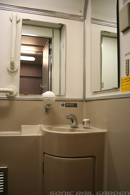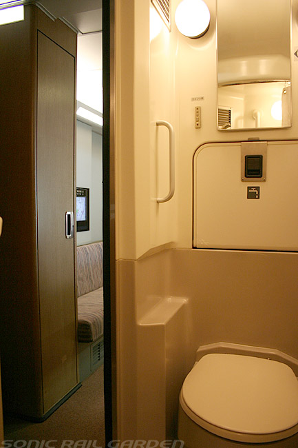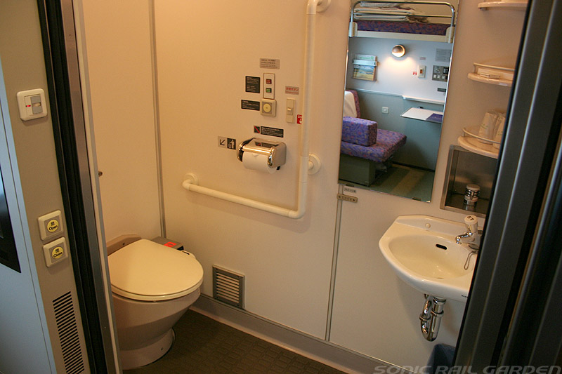4号車1号室は、編成内に1部屋だけの車椅子対応個室の「カシオペアコンパート」。 室内には対面でソファーが並び、その上に折り畳み式のベッドがセットされています。 ソファーは「カシオペアツイン」などと同様にベッドへの変換が可能で、付き添いの人との2名利用を想定した作り。 室内は車椅子での取り回しを考慮して、かなり広々としています。 個室内にはトイレと洗面台が備え付けられていますが、こちらも「カシオペアツイン」と比べてもかなりの広さ。 もちろんトイレは手すりを増設していて、洗面台は車椅子に座ったままでも使えるように低い位置に取り付けられています。 このほか、個室ドア・トイレドアの開閉は全て押しボタン式の自動ドアとなっていて、これらの取り付け位置も低めに。 またデッキから個室入り口までは、「カシオペアコンパート」部のみ広く取られていて、車椅子での移動を容易にしています。 形式図による設計上の室内の各寸法は、デッキから部屋までの通路幅が900mm、ドア開口部も同じく900mm。 ベッド幅も含めた室内の広さは約2,100mm×1,950mm。トイレのドア開口部は約1,010mm。 基本的なサービス内容は、全て「カシオペアツイン」と同等のサービスが受けられるようになっています。 |