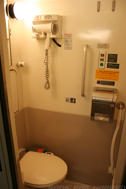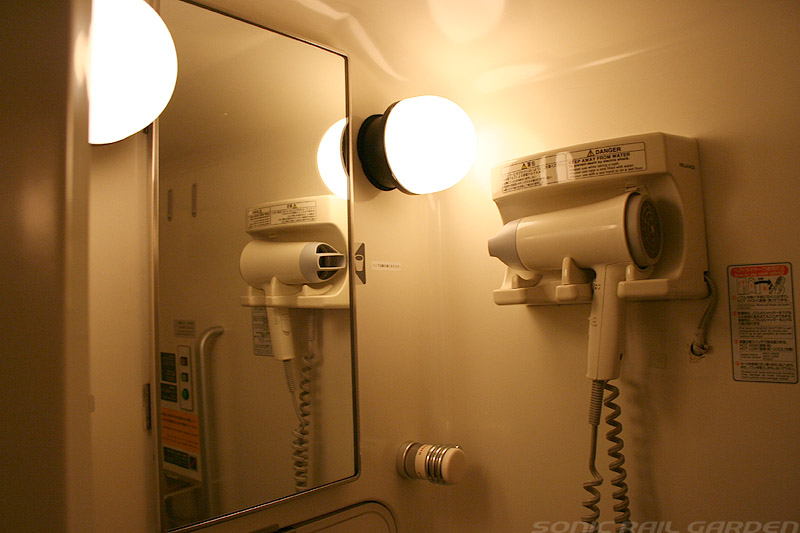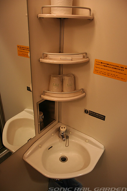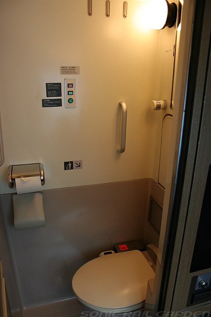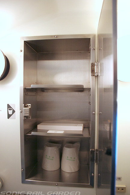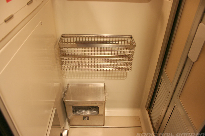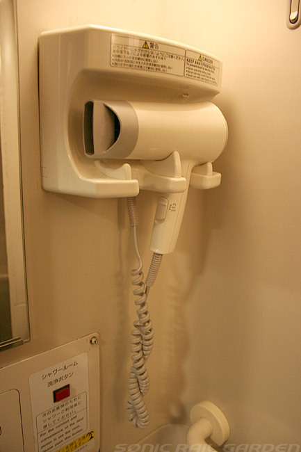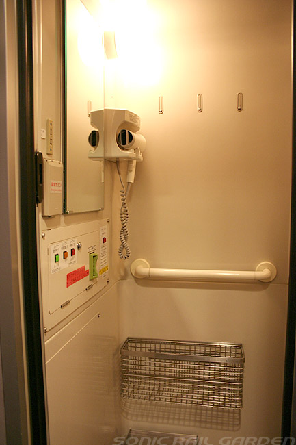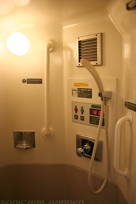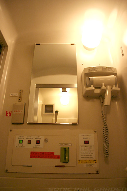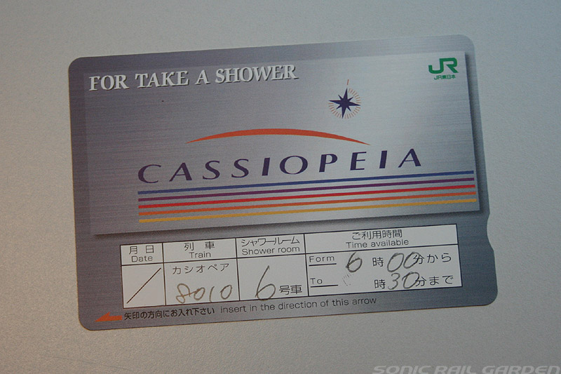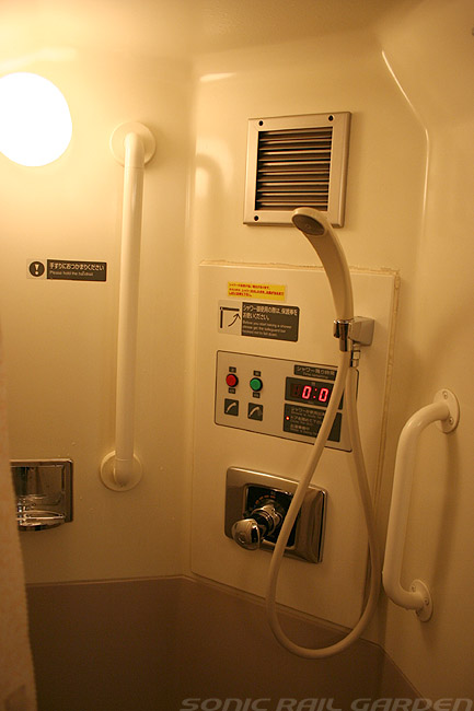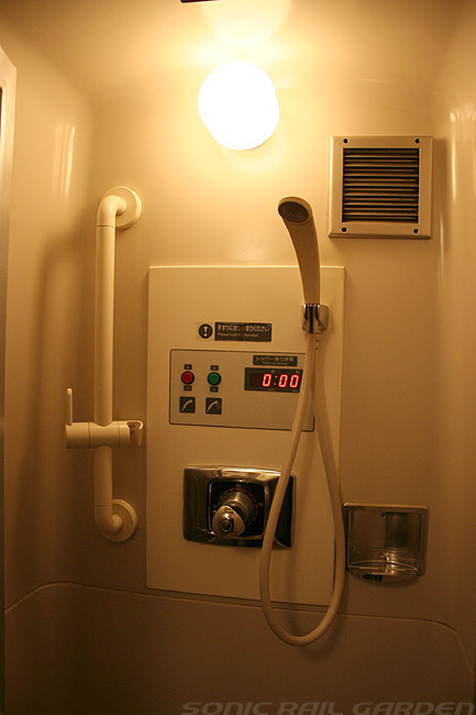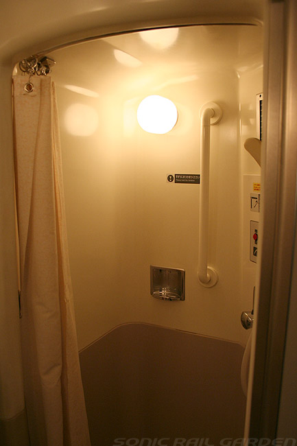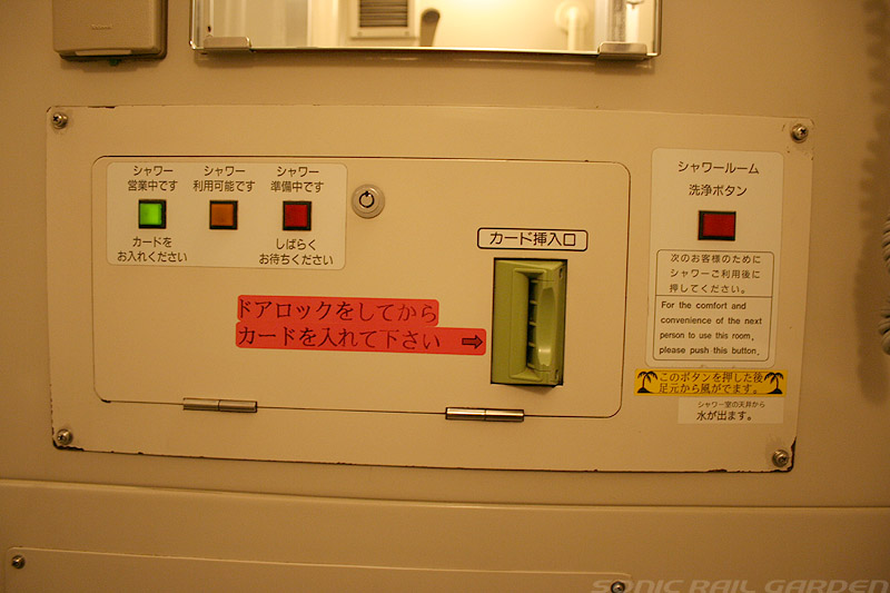 共用のシャワールームは、6号車と10号車に設置されています。 シャワーを利用するには予約とシャワーカードの購入が必要で、3号車の食堂車で利用の申し込みをします。 シャワーカードは一枚310円。シャワーの利用時間は1回で30分が割り当てられ、シャワーそのものは6分間の給湯となっています。 シャワールーム内には備え付けの石鹸やシャンプー・タオルといったアメニティは全く置いてありません。 食堂車で「シャワーセット」が販売されているので、必要であれば購入することとなります。 |