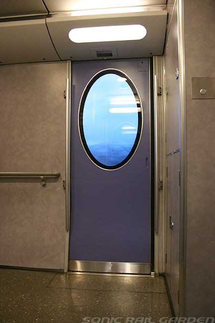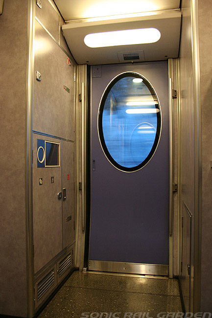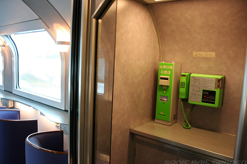 「カシオペア」では全ての個室がトイレと洗面台を完備しているので、サニタリースペースは2・7・11号車のみに設置。 いずれも洋式個室で洗面台をビルトイン。独立した洗面室は設けられていません。 デッキは意外とあっさりとした印象。ドアの丸い窓が優雅な雰囲気を漂わせています。 2号車のデッキにはカード式公衆電話が設置されています。 |