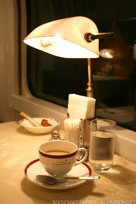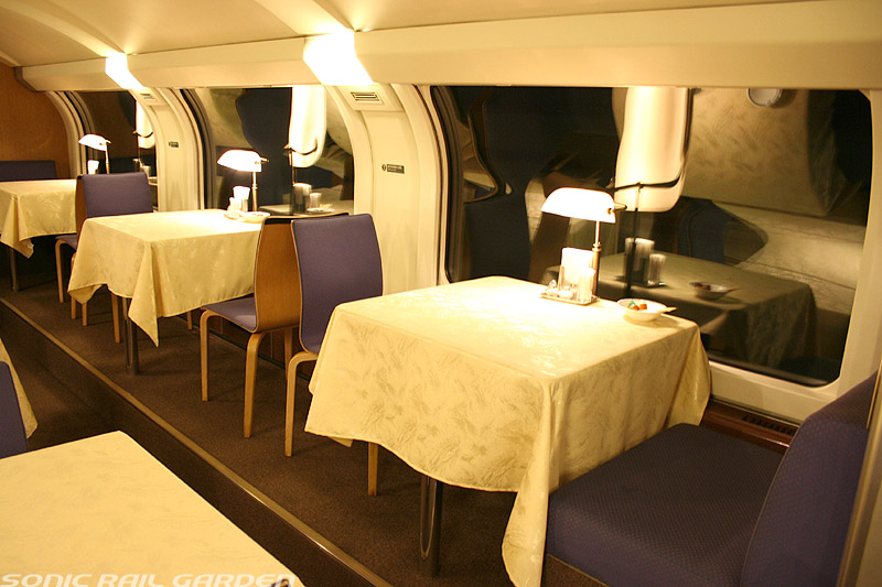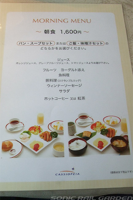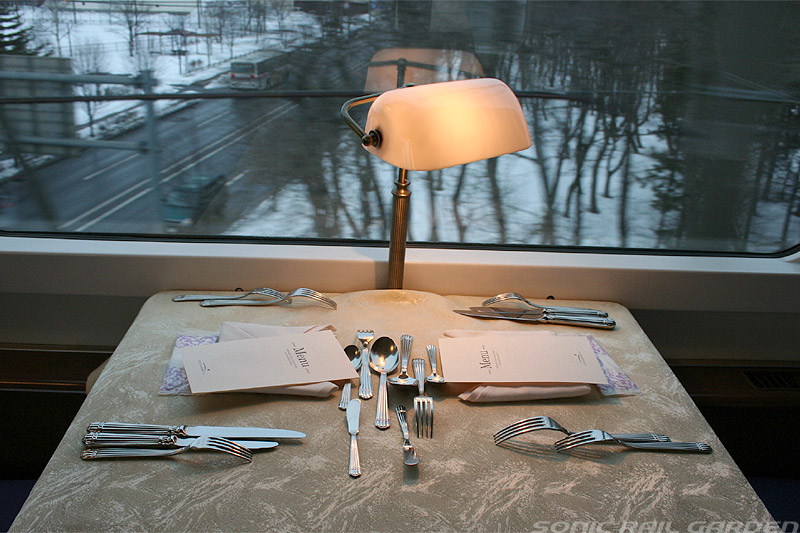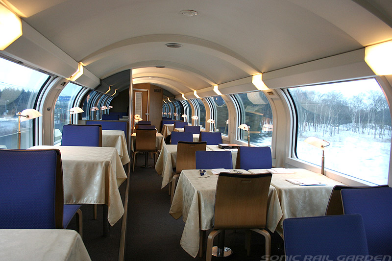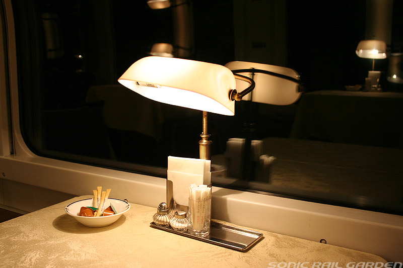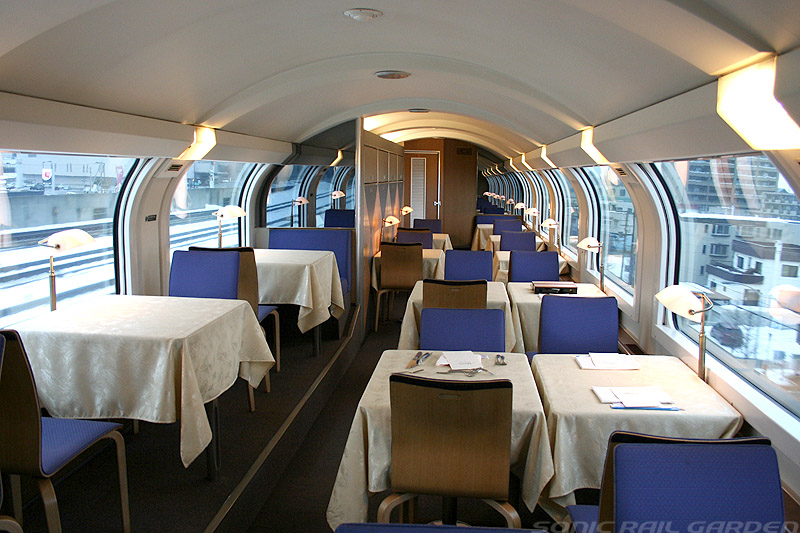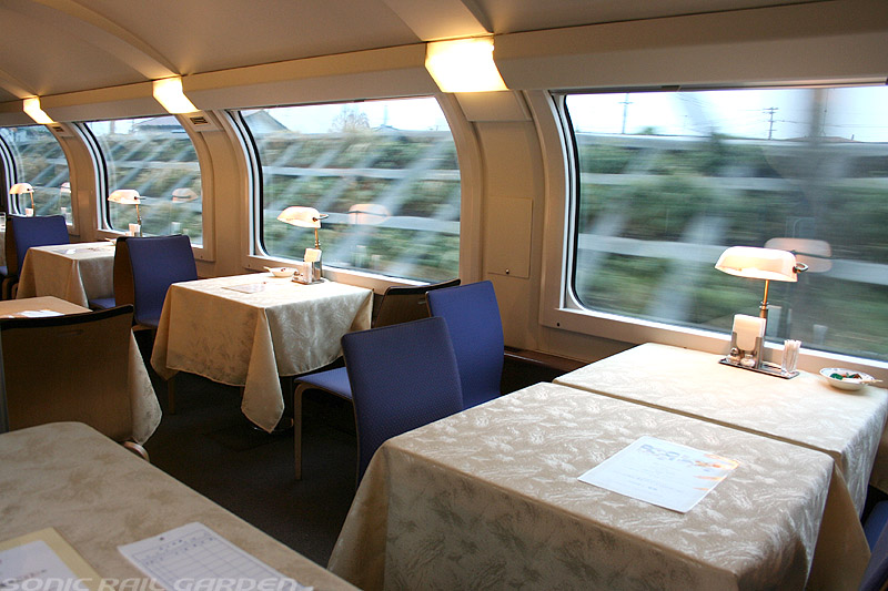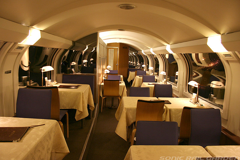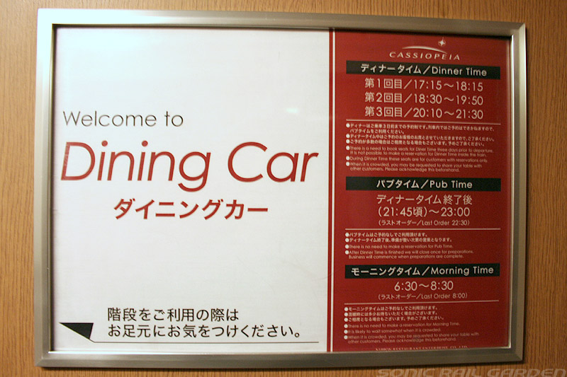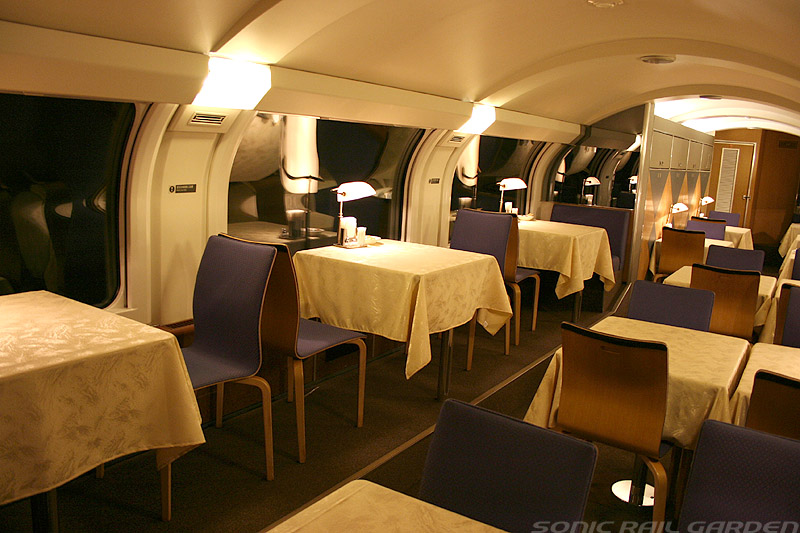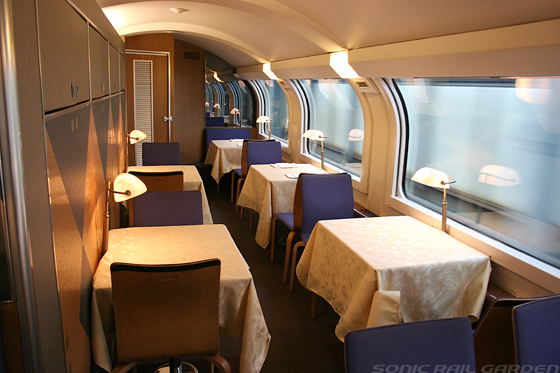 3号車は食堂車「ダイニングカー」。「北斗星」以来、北海道行き寝台特急では食堂車はなくてはならない名物車両。 2階建て構造の食堂車は、2階部分にホール席・1階部分に通り抜け通路を設けて、無用な通り抜け客の煩わしさを解消しています。 内装は清潔感溢れるホワイトやベージュをベースとして、木製チェアに張られた青いモケットが空間のアクセントに。 全体的にカジュアルな雰囲気で現在の「北斗星」の食堂車に通じるインテリア。 「トワイライトエクスプレス」の豪華絢爛な印象の食堂車とは180度違った雰囲気で、豪華寝台特急の双璧を織り成す好対照。 ホール席はドーム状に丸くなった天井が印象的。2人掛け席が8卓、4人掛け席が3卓で、定員は28人。 階下の通路直上となる席はフロアより一段高いセミハイデッキとなっています。 上下列車とも、ディナータイム・パブタイム・モーニングタイムの営業が行われています。 ディナータイムは3部構成で、1回目の17:15〜18:15は懐石料理コースのみ。 2回目の18:30〜19:50と3回目の20:10〜21:30はフランス料理コースと懐石料理コースが楽しめます。 ディナータイムは完全予約制で、乗車前にディナー予約券の購入が必要となります。 夕食には、予約制のディナータイムのほか、ケータリングミールの「カシオペアスペシャル弁当」も選択することができます。 3段のお重に北海の幸・山の幸・海鮮ご飯がぎっしり詰まったお弁当で、料金3,500円はわりとリーズナブルかも。 このお弁当のお届け時間は18:00〜19:30。各個室へのお届けでの利用のみで、食堂車でこの弁当を摂ることはできません。 こちらも乗車前に予約が必要となっています。 このほか、予約不要の夕食を車内で楽しむには、車内販売で駅弁などを販売しているので、それを購入して食べることもできます。 パブタイムは、おおよそ21:45〜23:00で営業。スタート時間はディナータイムの終了時間により前後することがあります。 パブタイムは予約不要で、誰でも食堂車の利用が可能。ラストオーダーは22:30なので実質1時間に満たない短い時間となります。 メニューには軽食やおつまみのほか、シチュー・ハンバーグ・パスタ・カレーといった本格的な食事も用意。 モーニングタイムは6:30〜8:30で営業。ラストオーダーは8:00、または積み込みの食材が終了となり次第営業終了となります。 モーニングも予約が不要。メニューは洋食(パンセット)か和食(ご飯セット)の2種類。 おかずは共通食材となっていますが、魚料理が洋食ではムニエル・和食では焼き魚と変化が付けられています。 なお、モーニングタイムは喫茶のみでの食堂車利用はできません。 シャワー室の利用カードやグッズもこの食堂車で購入できます。 食堂車および車内での全ての支払いには現金のほか、Suicaでの支払いも可能となっています。 |