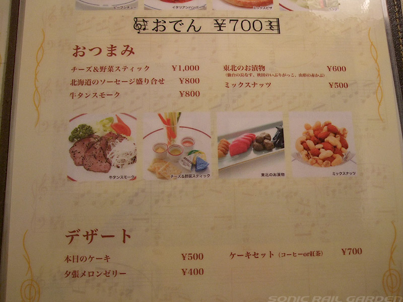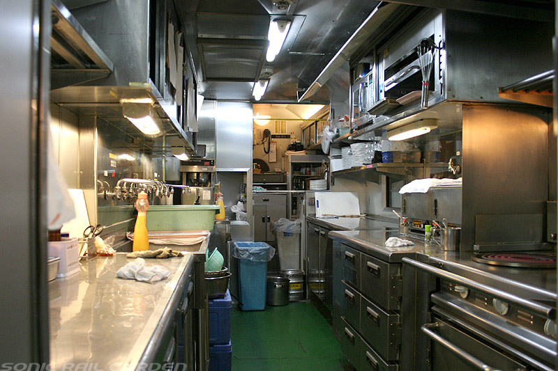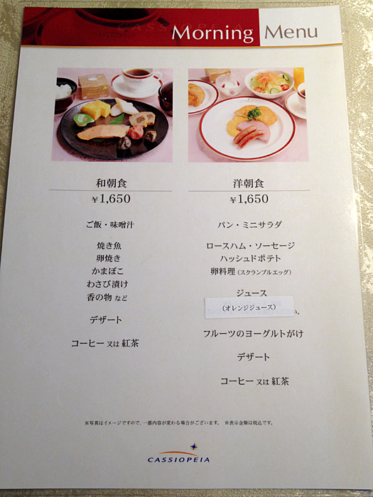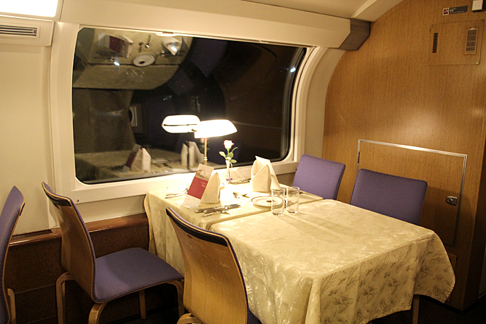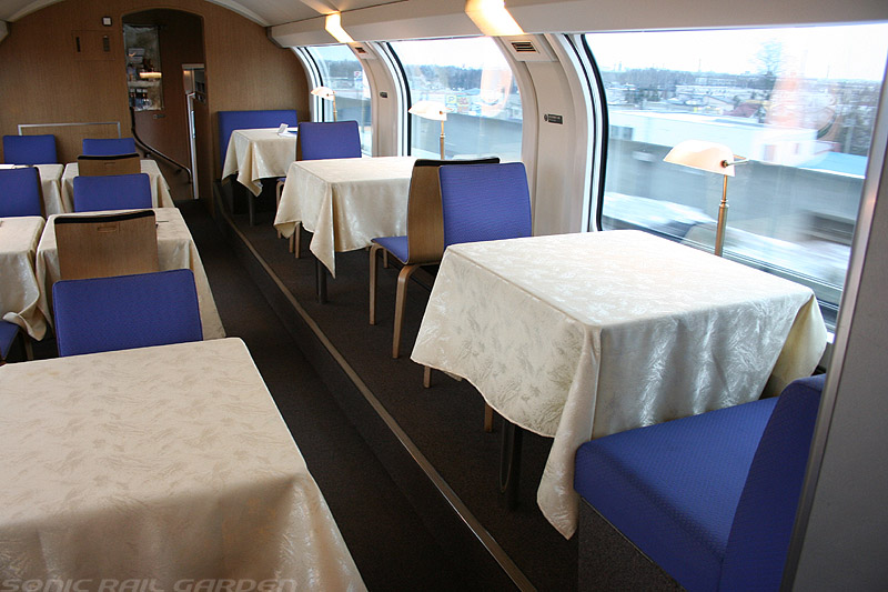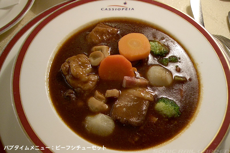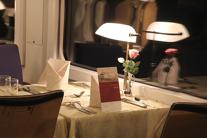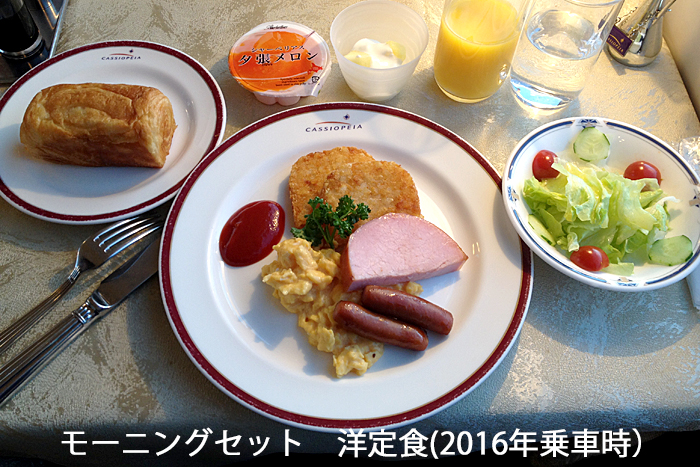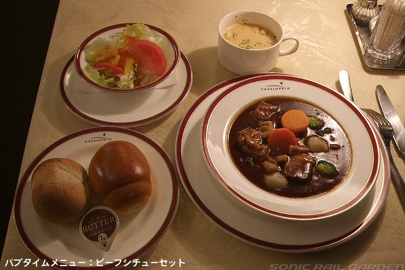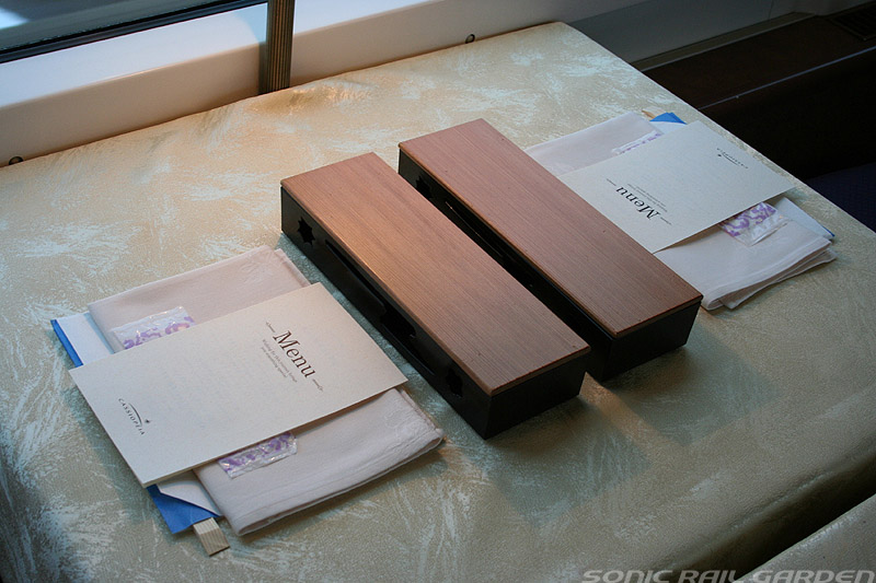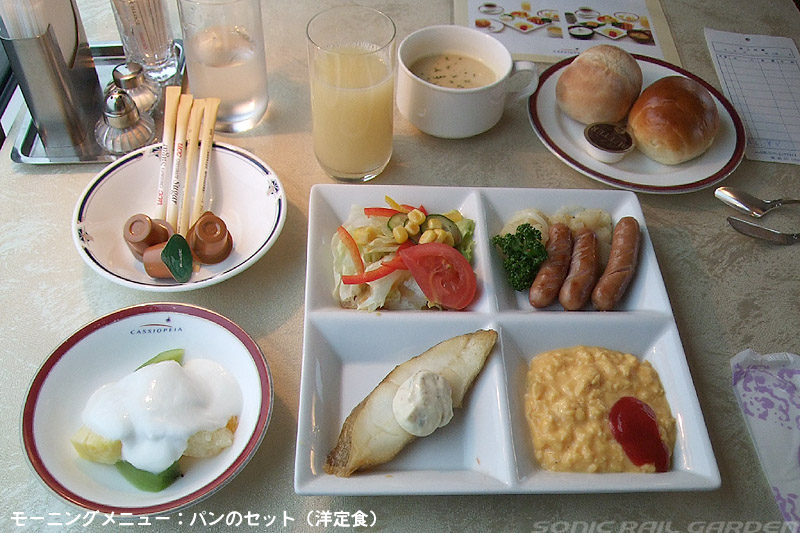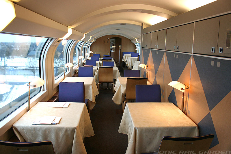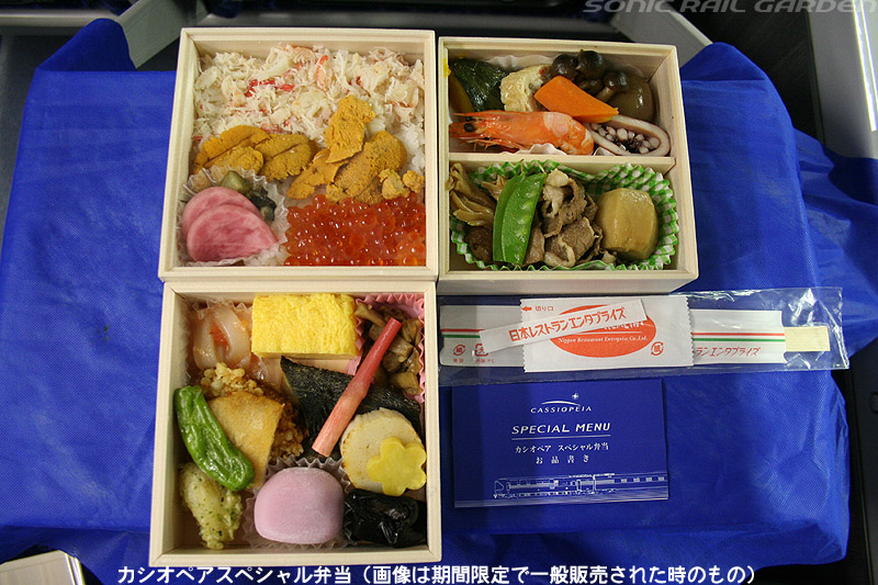 3号車は食堂車「ダイニングカー」。「北斗星」以来、北海道行き寝台特急では食堂車はなくてはならない名物車両。 2階建て構造の食堂車は、2階部分にホール席・1階部分に通り抜け通路を設けて、無用な通り抜け客の煩わしさを解消しています。 内装は清潔感溢れるホワイトやベージュをベースとして、木製チェアに張られた青いモケットが空間のアクセントに。 全体的にカジュアルな雰囲気で現在の「北斗星」の食堂車に通じるインテリア。 「トワイライトエクスプレス」の豪華絢爛な印象の食堂車とは180度違った雰囲気で、豪華寝台特急の双璧を織り成す好対照。 ホール席はドーム状に丸くなった天井が印象的。2人掛け席が8卓、4人掛け席が3卓で、定員は28人。 階下の通路直上となる席はフロアより一段高いセミハイデッキとなっています。 上下列車とも、ディナータイム・パブタイム・モーニングタイムの営業が行われています。 ディナータイムは3部構成で、1回目の17:15〜18:15は懐石料理コースのみ。 2回目の18:30〜19:50と3回目の20:10〜21:30はフランス料理コースと懐石料理コースが楽しめます。 ディナータイムは完全予約制で、乗車前にディナー予約券の購入が必要となります。 夕食には、予約制のディナータイムのほか、ケータリングミールの「カシオペアスペシャル弁当」も選択することができます。 3段のお重に北海の幸・山の幸・海鮮ご飯がぎっしり詰まったお弁当で、料金3,500円はわりとリーズナブルかも。 このお弁当のお届け時間は18:00〜19:30。各個室へのお届けでの利用のみで、食堂車でこの弁当を摂ることはできません。 こちらも乗車前に予約が必要となっています。 このほか、予約不要の夕食を車内で楽しむには、車内販売で駅弁などを販売しているので、それを購入して食べることもできます。 パブタイムは、おおよそ21:45〜23:00で営業。スタート時間はディナータイムの終了時間により前後することがあります。 パブタイムは予約不要で、誰でも食堂車の利用が可能。ラストオーダーは22:30なので実質1時間に満たない短い時間となります。 メニューには軽食やおつまみのほか、シチュー・ハンバーグ・パスタ・カレーといった本格的な食事も用意。 モーニングタイムは6:30〜8:30で営業。ラストオーダーは8:00、または積み込みの食材が終了となり次第営業終了となります。 モーニングも予約が不要。メニューは洋食(パンセット)か和食(ご飯セット)の2種類。 おかずは共通食材となっていますが、魚料理が洋食ではムニエル・和食では焼き魚と変化が付けられています。 なお、モーニングタイムは喫茶のみでの食堂車利用はできません。 シャワー室の利用カードやグッズもこの食堂車で購入できます。 食堂車および車内での全ての支払いには現金のほか、Suicaでの支払いも可能となっています。 |