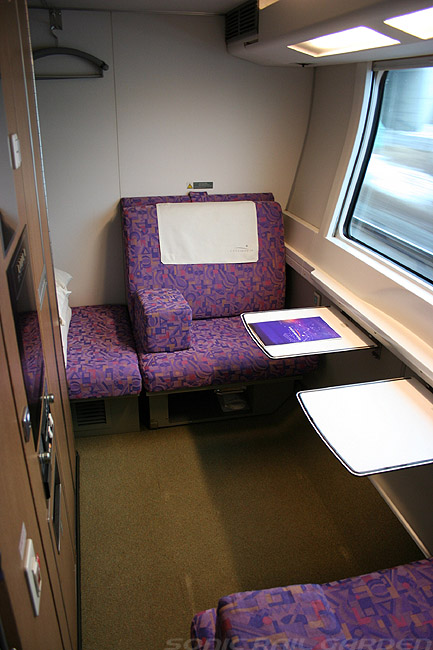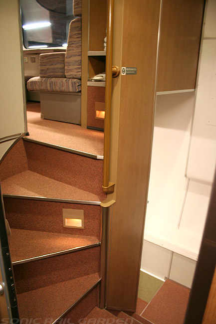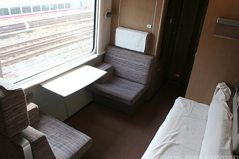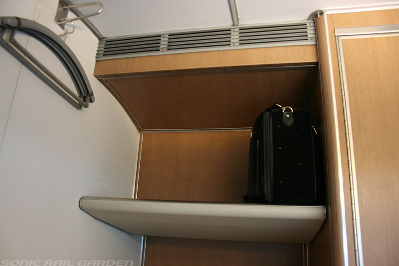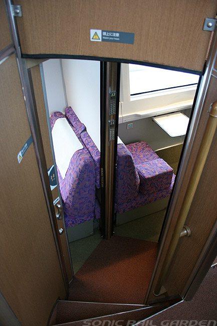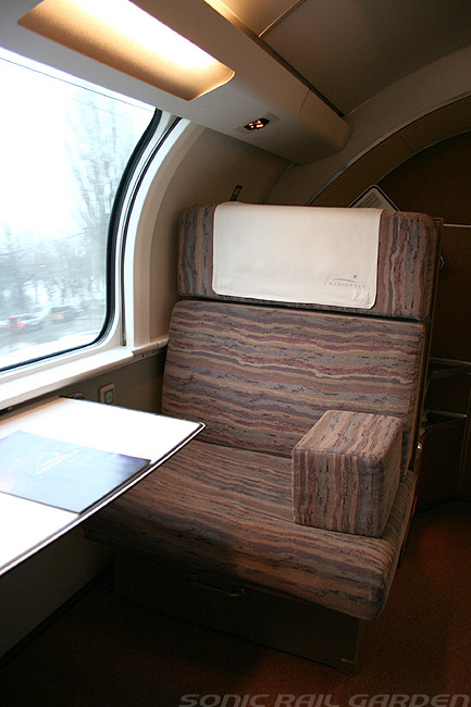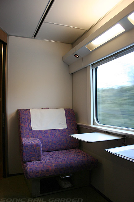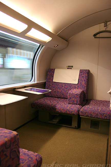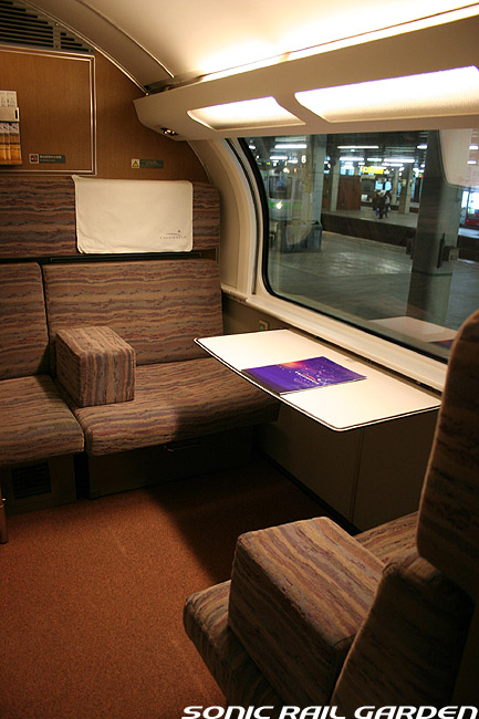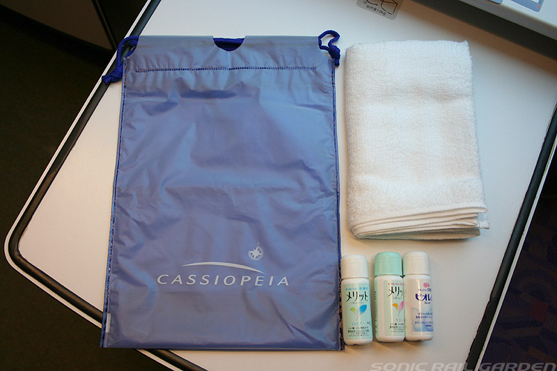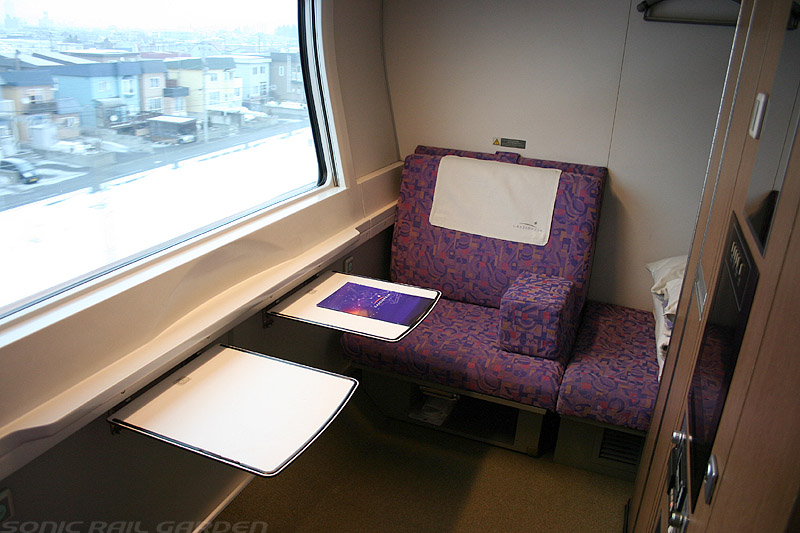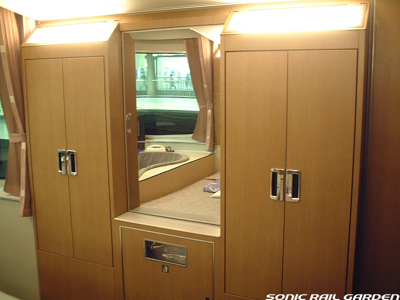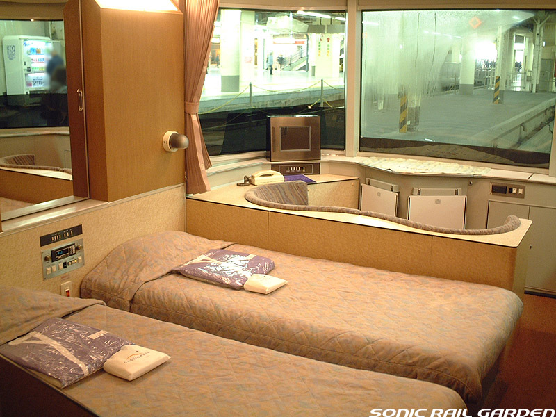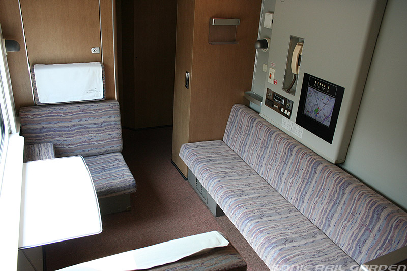 「カシオペア」の中でも最高位のランクにあるクラスが「カシオペアスイート」。 全ての個室がA寝台個室で組成されている中で、この「カシオペアスイート」と「カシオペアデラックス」は「特A個室」と称されています。 「カシオペアスイート」は車両内の設定位置によって2タイプの部屋があります。 「カシオペア」の中で最も人気が高く、また最も寝台券の入手が困難なのが、1号車車端部を占有する1号室「展望室タイプ」。 下り札幌行き列車では最後尾となり、展望窓から流れゆく景色を独占できます。 室内は、展望窓に面した部分にソファーを配置した「リビングスペース」と、その後ろにベッドを2台並べた「寝室スペース」。 個室入り口脇には、シャワーブースと洗面・トイレユニットがコンパクトに並べて配置されています。 ベッドサイズは1,950mm×850mm。 近年のビジネスホテルのシングルベッドより若干小さいサイズですが、列車内としてはかなりの大きさ。 シャワー・トイレユニットを含めない単純な住空間としての広さは、約4,300mm×2,800mm。 天井高も約1,160mmと、室内はとてつもない破格の広さを誇ります。 「カシオペアスイート」のもう1タイプが、1つの個室の中に2階構造を組み込んだ「メゾネットタイプ」 展望タイプが1室しかないのに対してこちらは1号車と2号車にそれぞれ3室づつ、合計6室あるスタンダードなタイプ。 個室入り口ドアを開けると、まず昇り階段と下り階段が目の前に。 階段を昇ると、2階部分には対面ソファーとシャワー・トイレユニットが配置された「リビングルーム」。 階段を降りると、1階部分にはツインベッドをレール方向に配した「ベッドルーム」。 リビングと寝室のいずれもコンパクトにまとまっていて、展望室タイプのような広さはありませんが、 部屋の中が2階建て構造になっていることによって、階段を昇り降りして空間を行き来することで、気分的な占有感が味わえそうです。 なお、2階のソファーはベッドとしても組むことができ、最大3名でのトリプルルームとしての利用も可能となっています。 「展望タイプ」「メゾネットタイプ」ともに、個室構造が違うだけでアメニティ設備やサービス内容は同じになっています。 まず室内にシャワー・トイレ・洗面台が完備されているのが「スイート」クラスの大きな特徴。 シャワーとトイレはユニット構造となっていますが、シャワーカーテンがあるのでシャワーとトイレは仕切ることができます。 シャワーは18分間の利用が可能。もちろん、バスタオルやフェイスタオル・バスマットも完備されています。 トイレの上には、収納式の洗面台。「北斗星」の「ロイヤルルーム」でお馴染みの収納構造となっています。 洗面台の上にはカガミがあり、このカガミは扉となっていて、中に洗面使用時のプラスチックコップがセットされています。 ベッドの上には浴衣とアメニティポーチ。 アメニティポーチにはロゴマークがプリントされていて、中にはシャワーキットやハブラシ・クシ・シェーバーから、 メンズキットとしてシェーブローションやヘアリキッド、レディスキットとして洗顔フォームや乳液などまで入っています。 このほか、室内にはBS放送などが放映される液晶テレビやBGM装置、コートクローク、食堂車直通の電話も完備。 ウェルカムサービスとして、始発駅発車後にワインやウィスキー・ソフトドリンクのウェルカムドリンクサービスもあります。 |