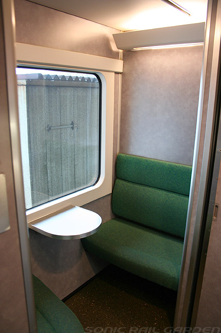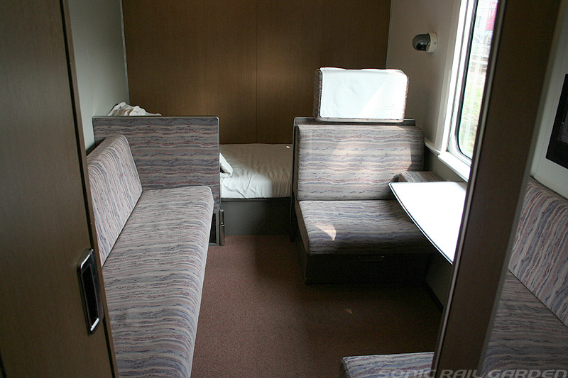 1号車1号室が「展望スイート」なのに対して、2号車1号室は「スイート」と同じランクの特A個室「カシオペアデラックス」。 車端部に位置するため平屋構造で、また展望窓も持たないので「スイート」とは別の個室名が付けられています。 この個室は2号車に1室だけの設定となっています。 室内は、入り口から入るとまず目の前にシャワー・トイレユニット。そこから左へ曲がるとリビング兼寝室スペース。 ソファー状態の室内には、窓側に向かい合わせのソファーと通路側には長椅子のようなベンチソファー。 その奥は枕木方向に固定型のベッドがセットされています。 窓側のソファー2台は座面をスライドさせることによってベッドになり、またベンチソファーも座面を起こすとベッドに。 結果、室内には3台のベッドを組むことができるので、この部屋も3人用のトリプルルームとしても利用が可能です。 片側に通路があるため個室の広さは展望タイプには負けますが、天井の高さはメゾネットタイプと比べてダンゼンに開放的。 室内設備やサービスは「カシオペアスイート」と同等で、18分間の利用が可能なシャワールームも完備。 アメニティキットやウェルカムドリンクなどのサービスも充実したものを受けることができます。 |