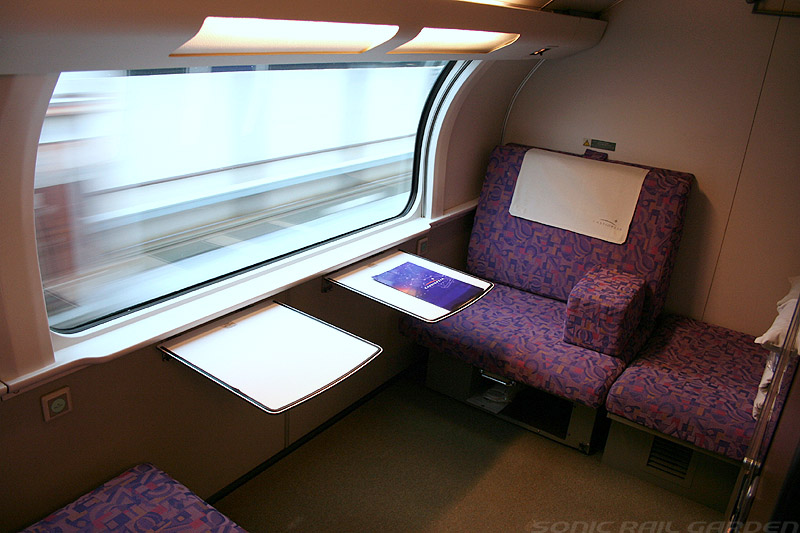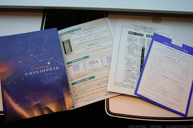 部屋のテーブルにセットされている上品なデザインのパンフレットは、室内設備の説明書。 | ベッドのセッティング方法から車内販売・食堂車の案内、BS放送の番組表までが収められている。