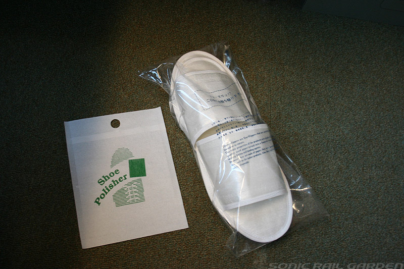使い捨てスリッパと靴磨きのシューシャインペーパーもセットされている。 |