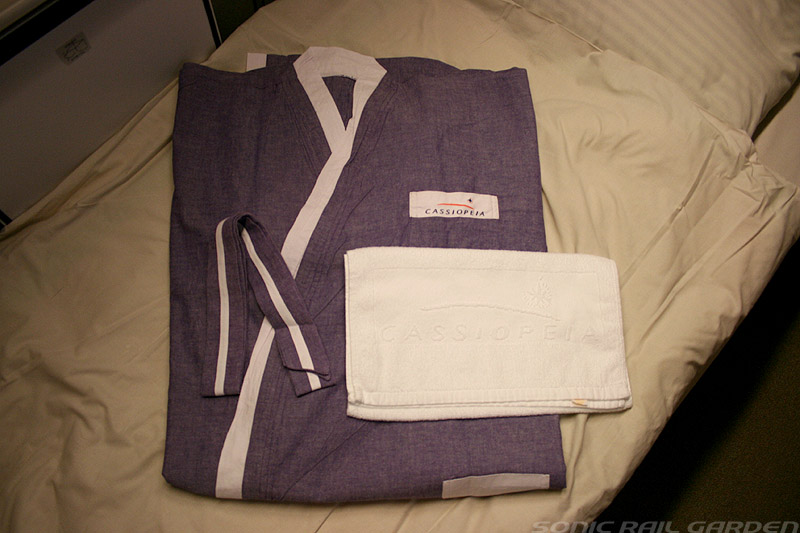 就寝用には浴衣。 | 室内のコーディネイトに合わせたパープルの浴衣に「CASSIOPEIA」のロゴ入り。 全室にトイレと洗面台が完備されているので、室内にはフェイスタオルも用意されている。