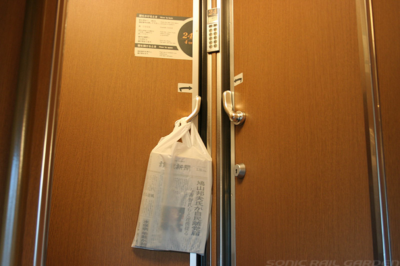 朝刊はドアノブにビニール袋に入れられた状態で、全室に配布される。 |