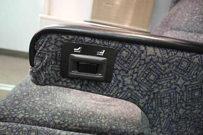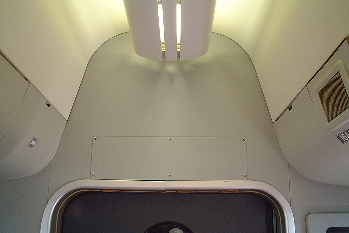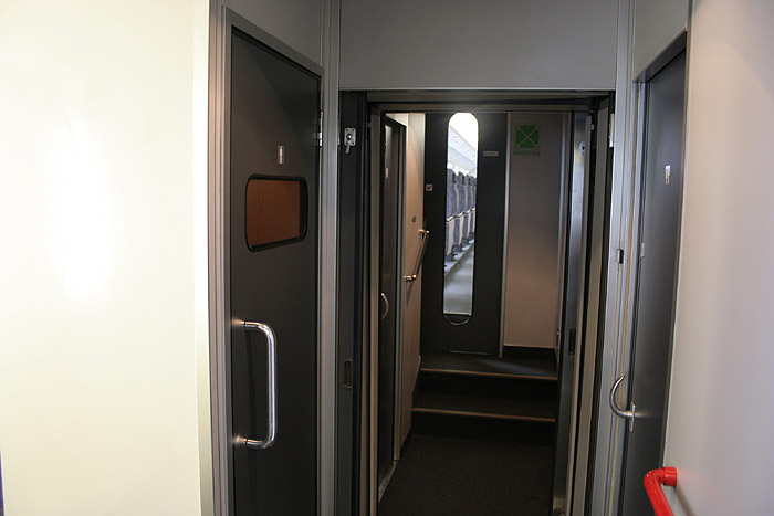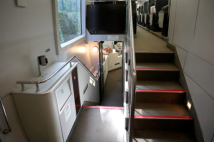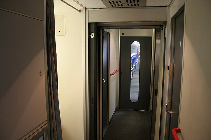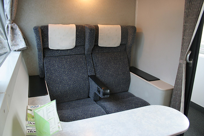 2号車の1階のグリーン個室も3室が健在です。 こちらもソファー自体はモケット張替えのみに留まり、電動リクライニング機構はそのまま。 中央のテーブルにあったビデオ再生可能のビデオデッキとオーディオモニターは撤去されました。 また、窓の下にあったオーディオサービスのコントロールパネルも撤去されています。 通路奥は行き止まりとなるため、非常時用のエマージェンシーハッチが設置されています。 |