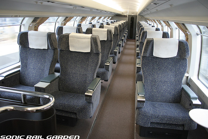 10号車の展望席も大幅に手が加えられました。 ここには以前、フランスのTGVで使われているコンパン社製の座席が並べられていましたが、今回のリニューアルで舶来品のバブリーな座席は撤去。 普通車「カスタムユニット」に導入されたものと同じ座席が装備されました。 また、以前はシートピッチ810mmで4列が設定されていましたが、座席交換と同時に3列に変更。 シートピッチ1,000mmという余裕の配置になり、窓割りにピッタリ符合した座席配置となりました。 グリーン展望席は非リクライニングシートですが、こちらの展望席はリクライニング、座面スライドとも可動します。 展望席は、夜間走行の際は天井照明は全て消灯。 室内は真っ暗に近いぐらいになりますが、窓ガラスへの映りこみが全く無いので、夜のダイナミックなパノラマが楽しめます。 大幅にリニューアルされたカスタムユニット展望席ですが、眺めはというとグリーンユニット展望席同様に2・3列目は大ハズレ。 1列目だけに「展望席」としての価値が見出せるので、まさにチケット購入時に「早い者勝ち!」となります。 私の経験から言うと「金曜を除く平日の午後・下り便の後ろ展望最前列」は当日でも余裕で買えることが多いです。 |