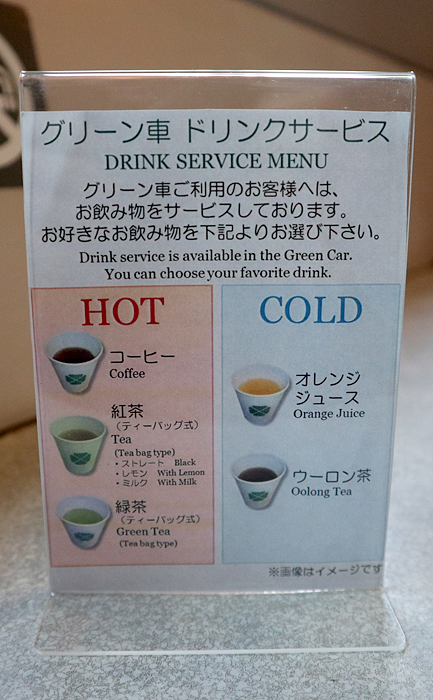 以前のグリーン席は、山側がブラウン系・海側がパープル系のモケットでしたが、リニューアル後はグレートーンのモケットに統一。 登場時のポップな感じは無くなり、全体的に落ち着いた「大人のリゾート」な雰囲気になりました。 収納式のレッグレスト、インアームテーブルも引き続き装備。 アームレスト内側にあったAVコントロールパネルは撤去されて、オーディオサービスは終了となっています。 2007年にグリーン席は再度リニューアル改装が行われ、客室インテリアのカラーコードはグレートーンそのままに、 座席の交換・カーペットの張替えなどが行われました。 新しい座席は以前の座席に比べて、背もたれ部分のホールド性が良くなっていて、クッションも柔らかめになっています。 この時の改装で大きく姿を変えたのが1号車の展望席で、3列配置:総席数9席から2列配置:総席数6席となりました。 1列減らしたことでシートピッチを大幅に拡大、リクライニング機構・レッグレストを持った座席が設置されました。 床面の嵩上げが行われ、最前列は以前の2列目の高さに設置されたので、座席からの目線の高さが高くなっています。 (残念ながら、目線が高くなったことで前方の視界が若干悪くなってしまいました。) 「スーパーひたち」から「成田エクスプレス」あたりまでは、グリーン車でおしぼりやドリンクサービスを行っていたJR東日本ですが、 現在の在来線特急でこのサービスが行われているのは「スーパービュー踊り子」のみとなってしまいました。 登場当初は「SVO」のエンブレムマークがプリントされた紙コップでしたが、現在はコスト削減のためか「はやて」と同じ紙コップに。 ドリンクは、ホットコーヒー・紅茶・アイスウーロン茶・オレンジジュースから選べます。 |