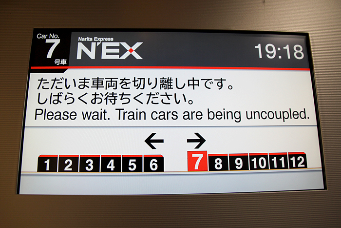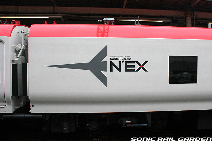 デッキ乗降ドア付近には、253系の電光表示板に変わって液晶画面での列車案内表示装置が設置されました。 日本語と英語で列車名と停車駅(ルートマップと表示)を表示。停車駅案内には現在位置で電車のアイコンが動く仕掛けも。 ユニバーサルデザインを推し進めている中で、この液晶表示板の下には点字での車内設備案内板が貼り付けられました。 デッキには折りたたみ式のジャンプシートも設置されています。電話コーナーはグリーン車の6号車(12号車)に、カード専用電話が。 1号車の成田空港寄りのデッキにはAEDが設置されています。 多目的室は6号車(12号車)に設置。通路を挟んでその前には車内販売準備室があり、アイスストッカーや流し台などが設置されています。 エクステリアのドア付近にはフルカラーLEDによる行先表示機。日本語と英語を交互に表示します。 LED表示の起動時には、SSTをイメージしたN'EXのシンボルマークが赤いラインを引いて飛んで来る動画が流れるという凝り様。(→■) |