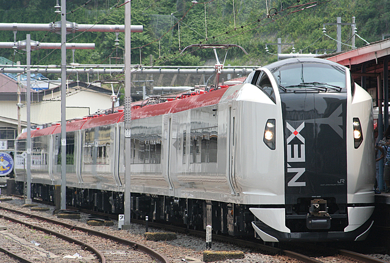 2010年の成田スカイアクセス開業に伴い、それに先手を打つ形で2009年10月に運転を開始しました。 253系で確立した「N'EX」のブランドイメージをそのまま引き継ぎ、外観には赤・黒・白のブロック塗装。 内装は、253系で迷走した果てに破綻した座席配置を止め、オーソドックスなリクライニングシートを採用。 新宿方面と横浜方面の2列車併結運転時に備え、先頭車前面は行き来が可能な作りになりました。 2009年10月にデビューし、2010年7月には「成田エクスプレス」の全列車がE259系となりました。 しかし、成田スカイアクセス経由の京成スカイライナーによるシェア巻き返しは凄まじく、 「成田エクスプレス」は徐々に乗車率が落ち込むようになっていきます。 余剰になった編成を使って「マリンエクスプレス踊り子」が運転されたり、 試験的に横須賀・河口湖・八王子発着などの延長運転が行われたりしましたが、 これらの延長運転は結果奮わずで、最終的に全列車が大船・新宿発着に統一されることになりました。 また、運用を見直すことで、一部の編成を特急「しおさい」へと投入されることになりました。 この「しおさい」投入に向けて、誤乗車防止の観点から外観塗装を変更することになり、 「成田エクスプレス」のブランドイメージを払拭し、汎用デザインの塗装へと変身することに。 SSTをイメージしたシンボルマークとN'EXのロゴマークが車体から消えることになりました。 2009年 グッドデザイン賞受賞 2010年 鉄道友の会ブルーリボン賞受賞 2011年 ブルネル賞優秀賞受賞 エクステリア・インテリアデザイン:GK Design Group, Inc. (撮影時期:2009年・2015年) |