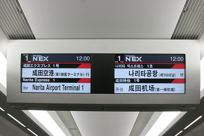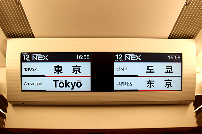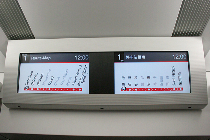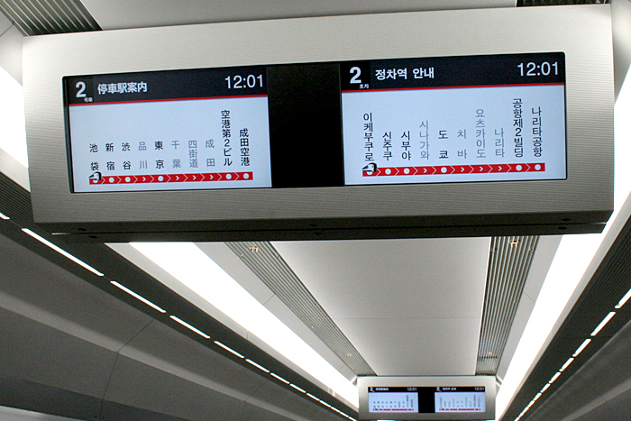 先代の253系「成田エクスプレス」では、LEDスクロール式の情報装置がデッキや客室端部の天井部に設置されていました。 今回の新型E259系では、17インチのLCD情報装置をデッキのほか、客室内では車端部のほか客室中ほどにも設置しています。 様々な情報が日本語・英語・中国語・韓国語の4ヶ国語で次々と美しく表示され、これは外国人から高評価を得られそうです。 |